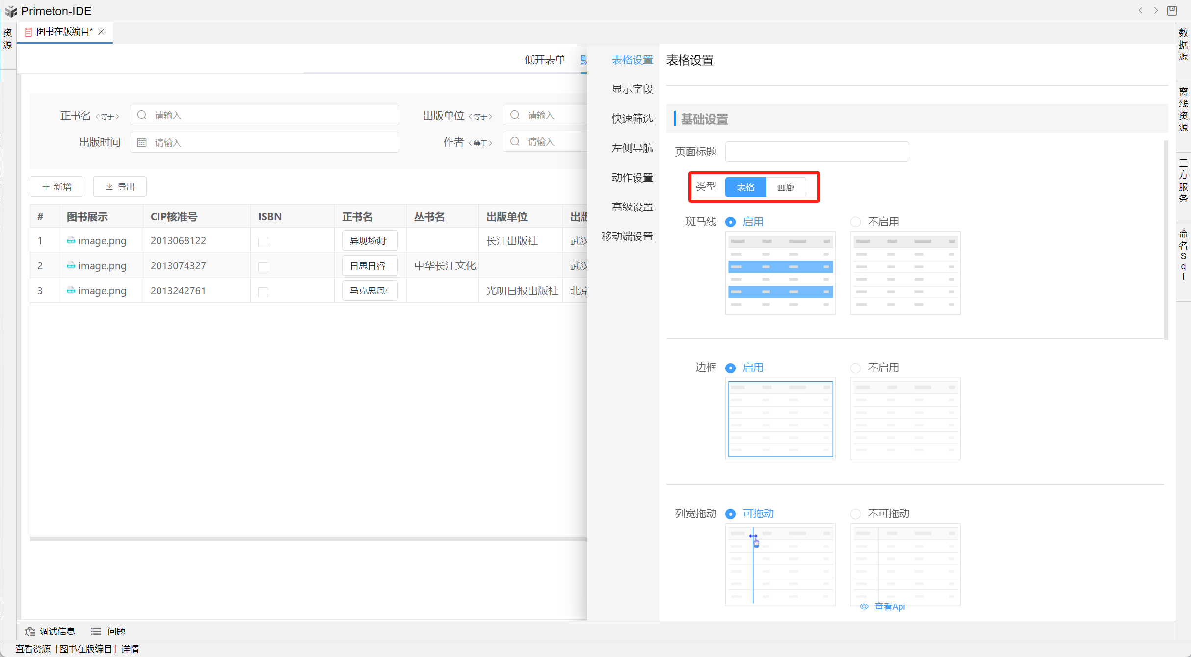 在表格设置下基础设置类型中可以为视图选择展示类型:表格/画廊。
