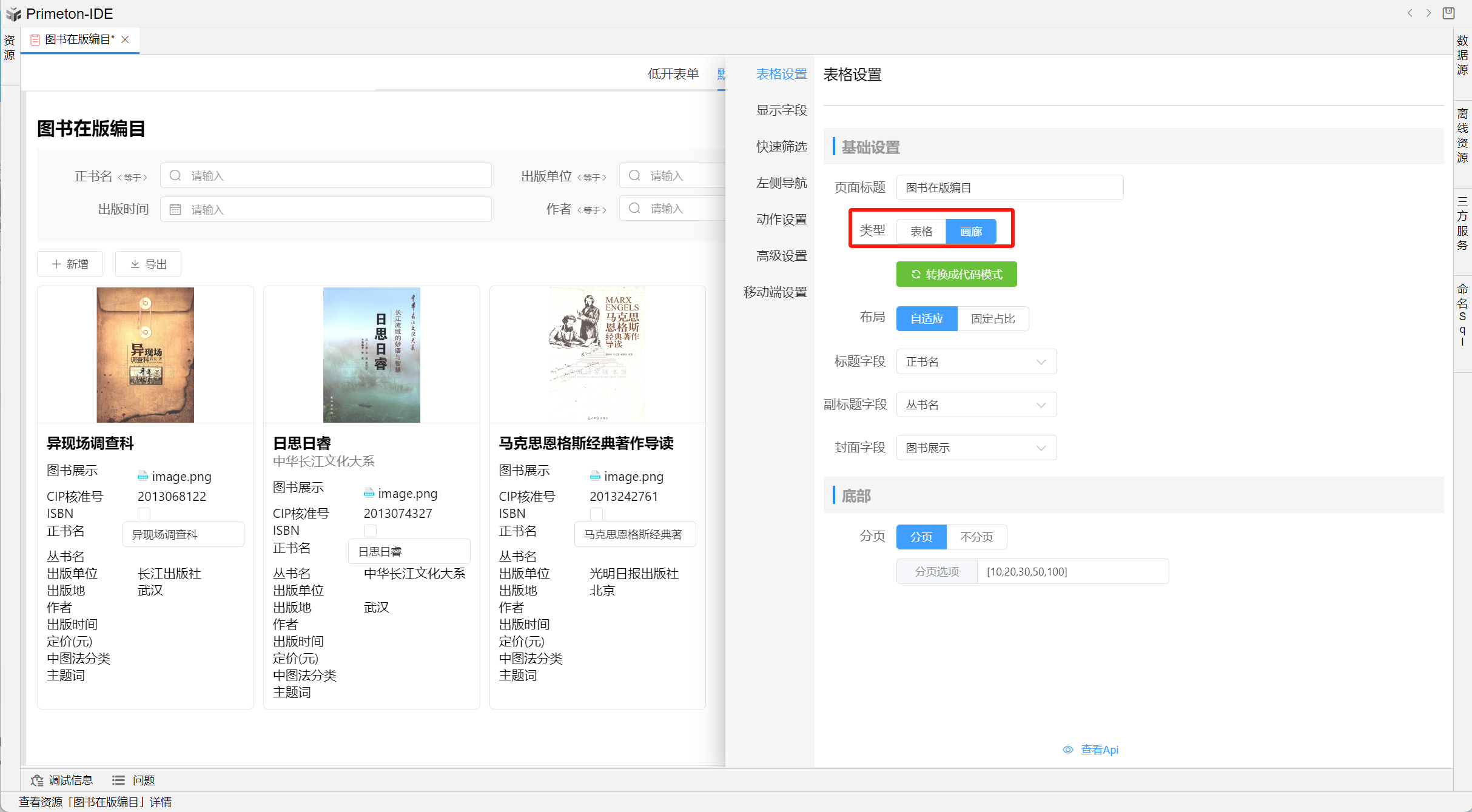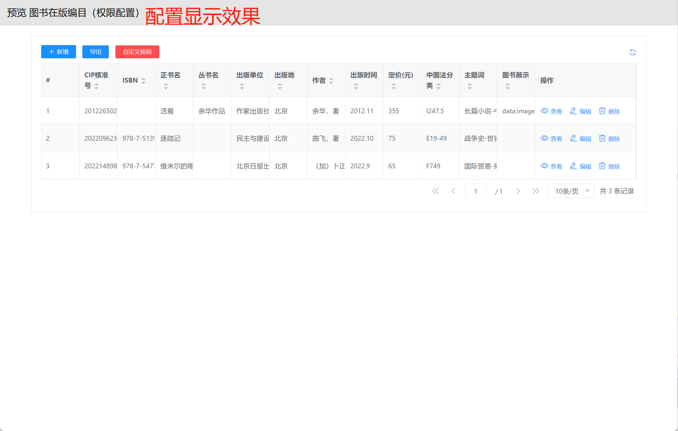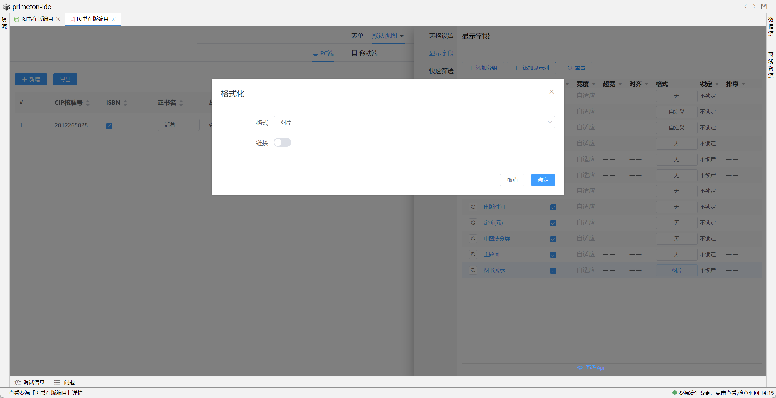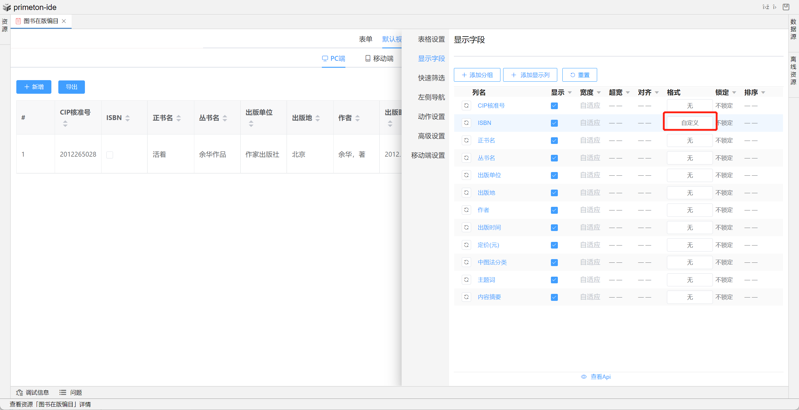 视图展示支持多种数据格式,本部分将以"图书在版编目"为示例进行配置讲解