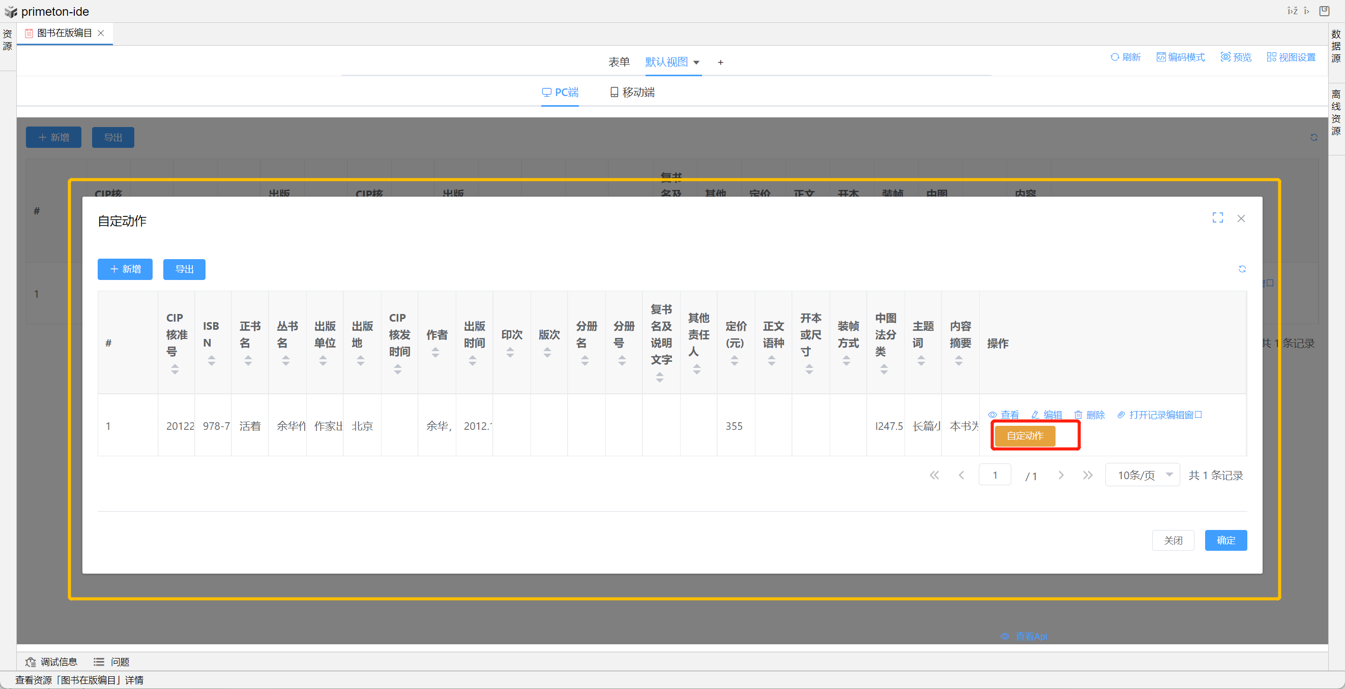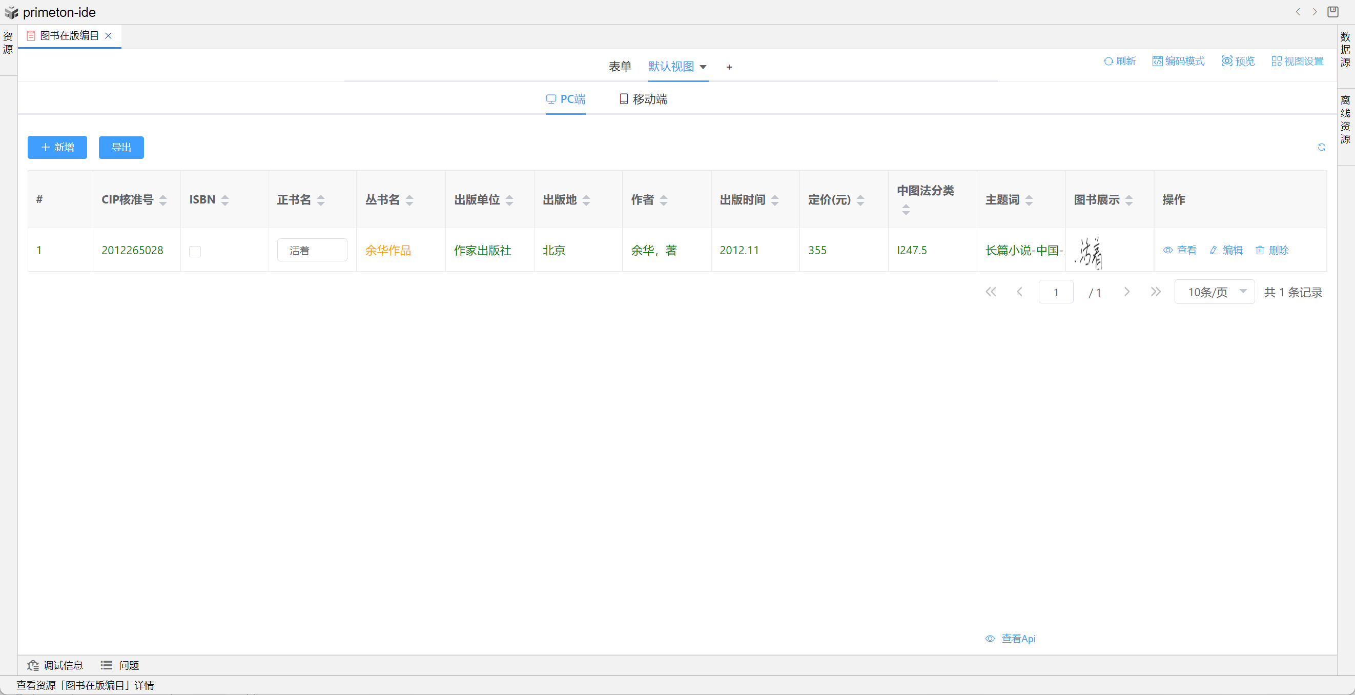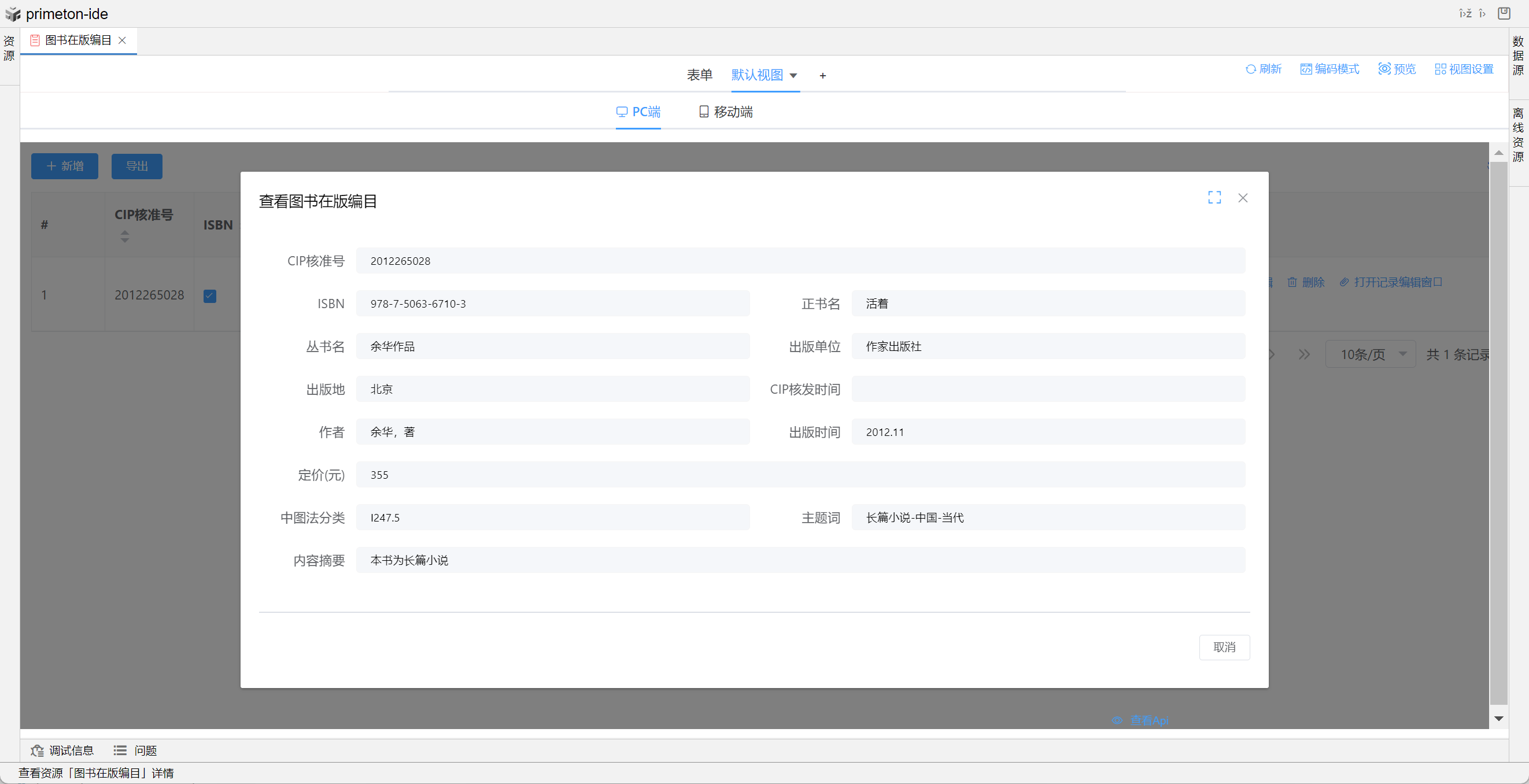 视图展示支持多种数据格式,本部分将以"图书在版编目"为示例进行配置讲解