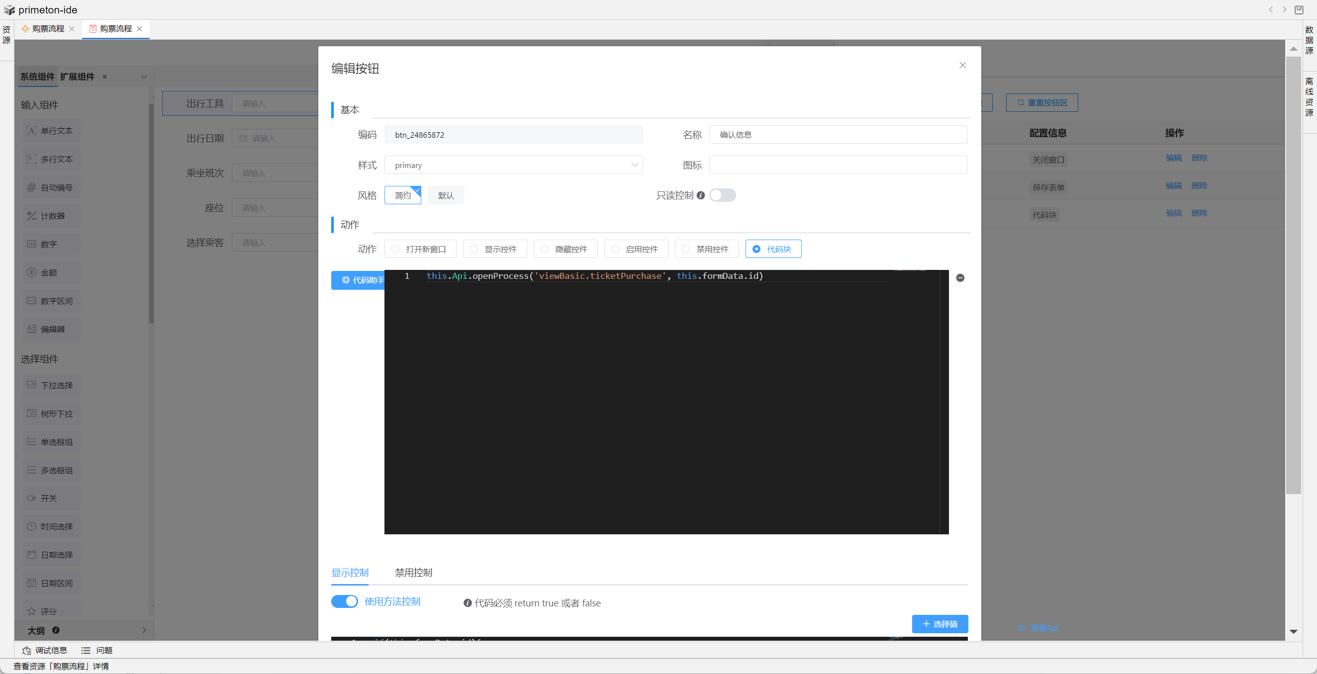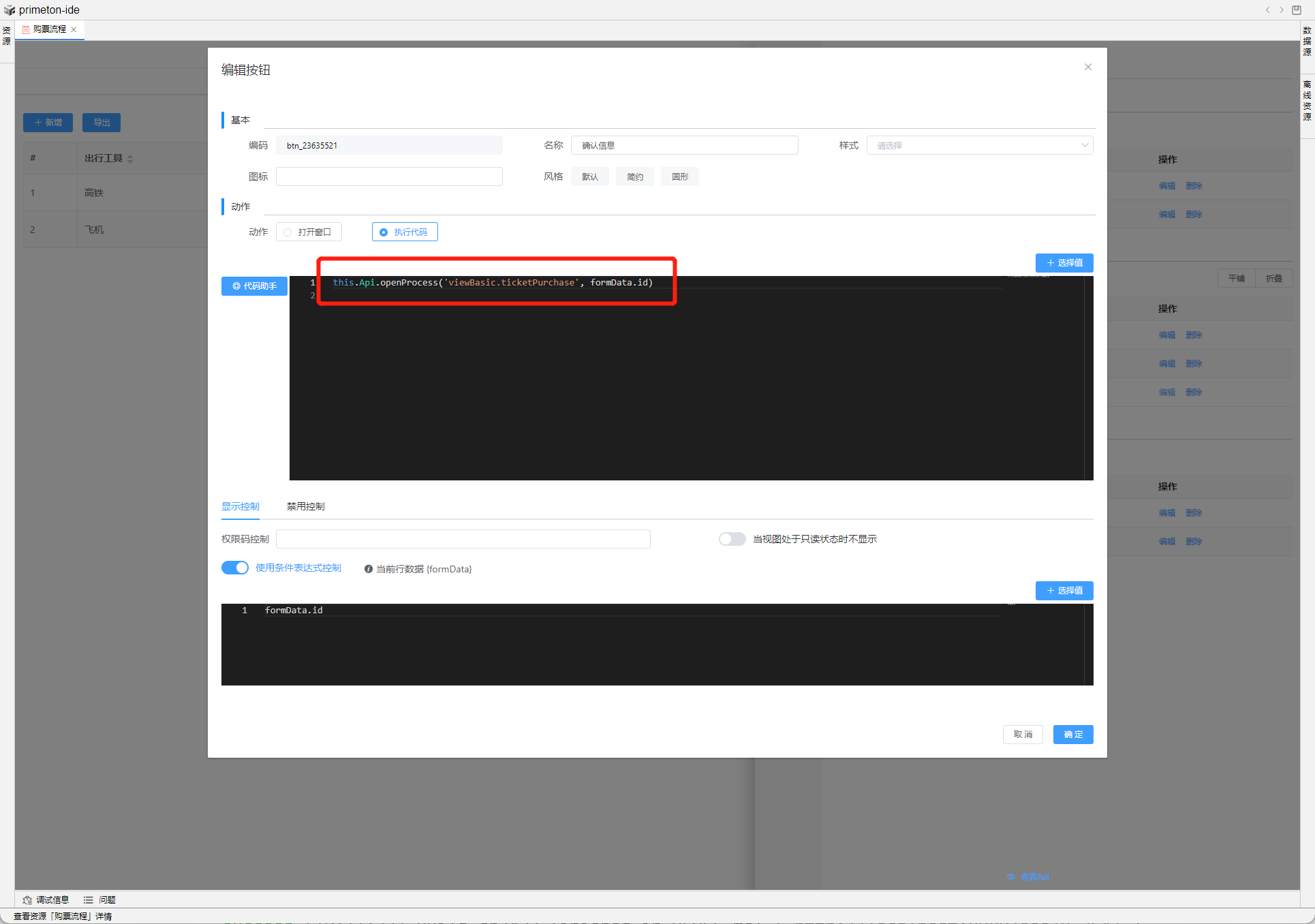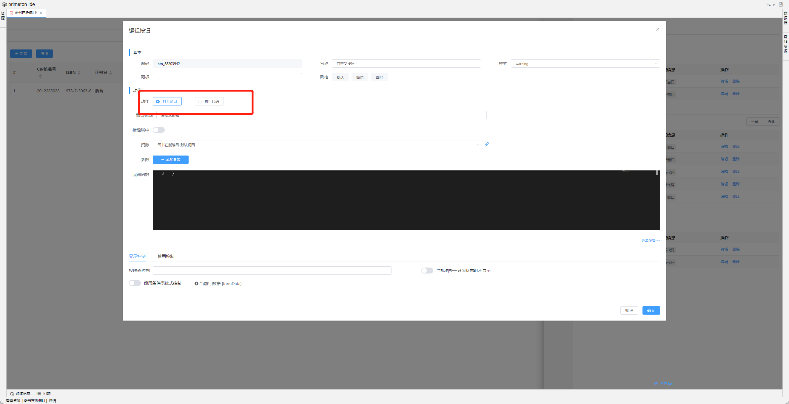 按钮编辑可以选择打开弹框还是执行代码