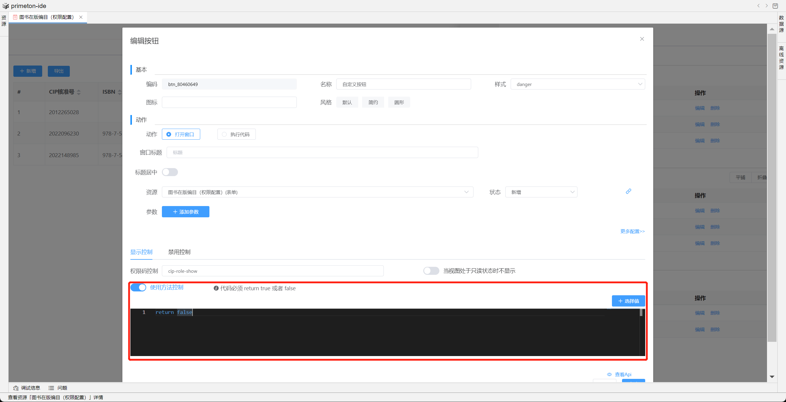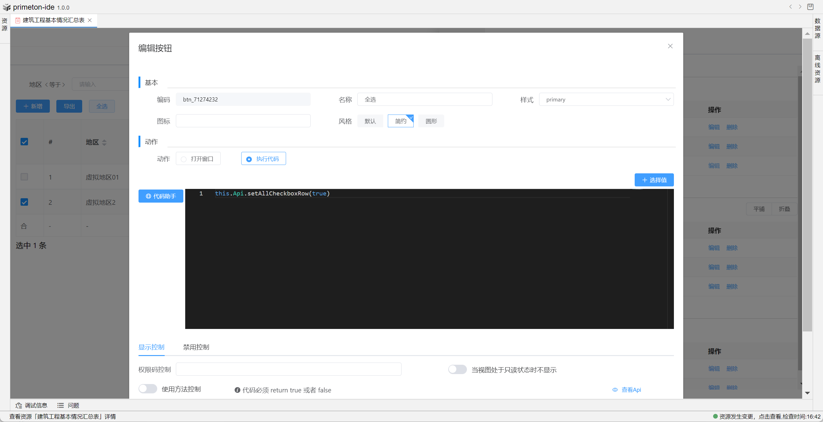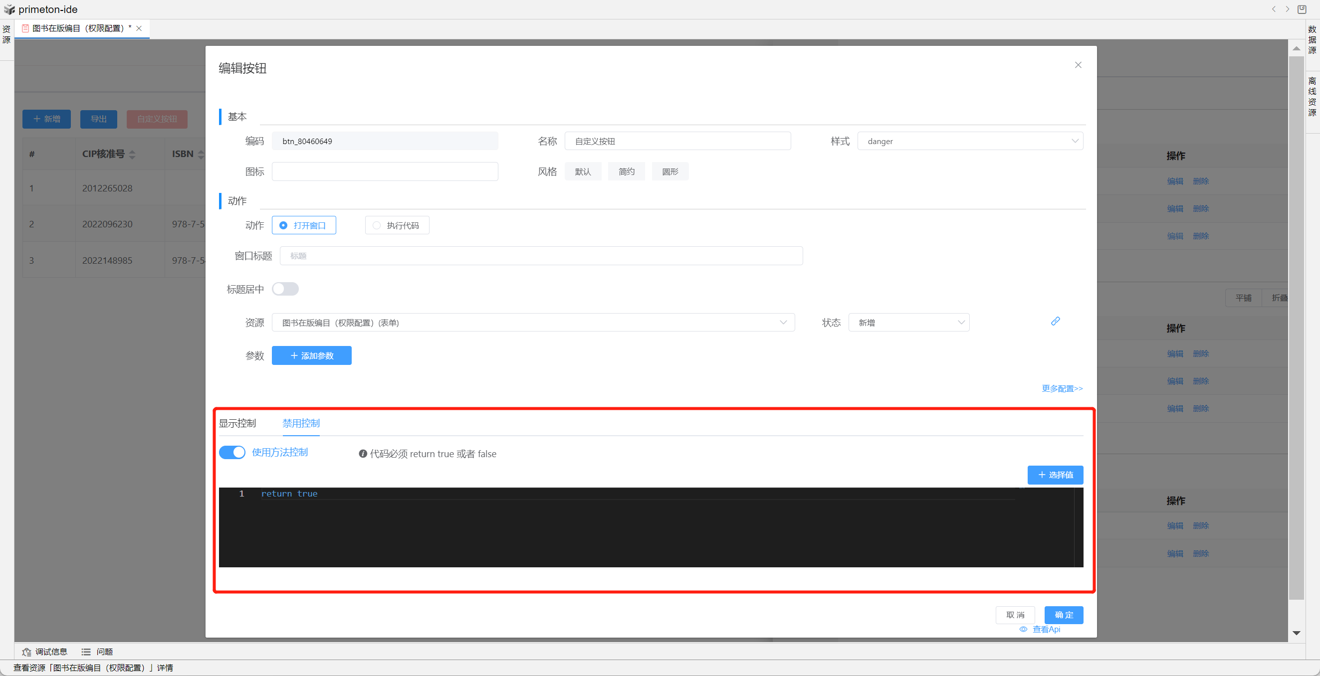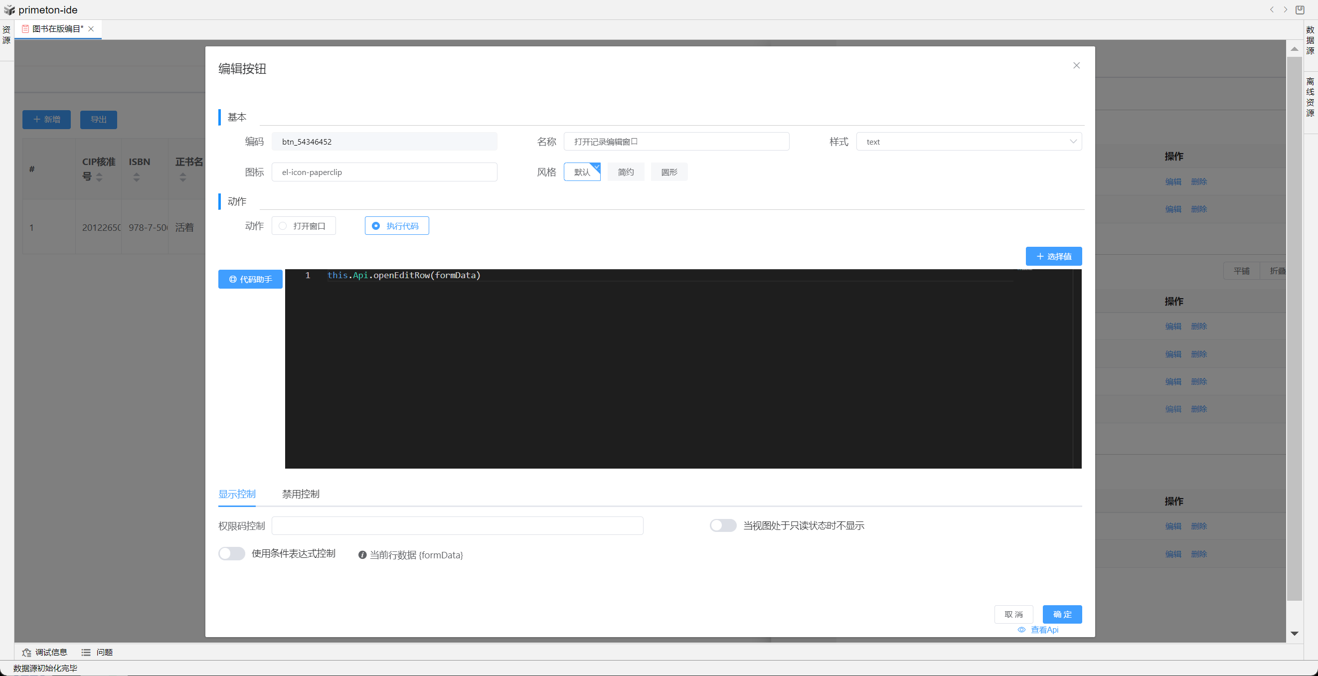 按钮编辑可以选择打开弹框还是执行代码