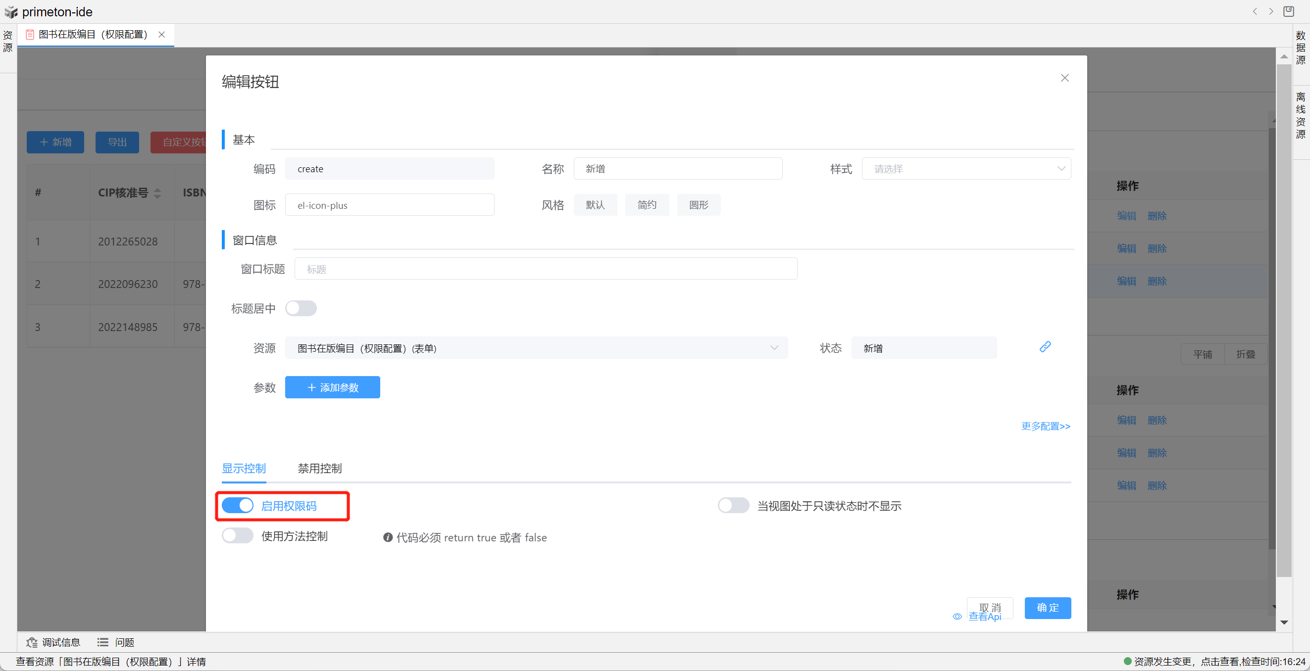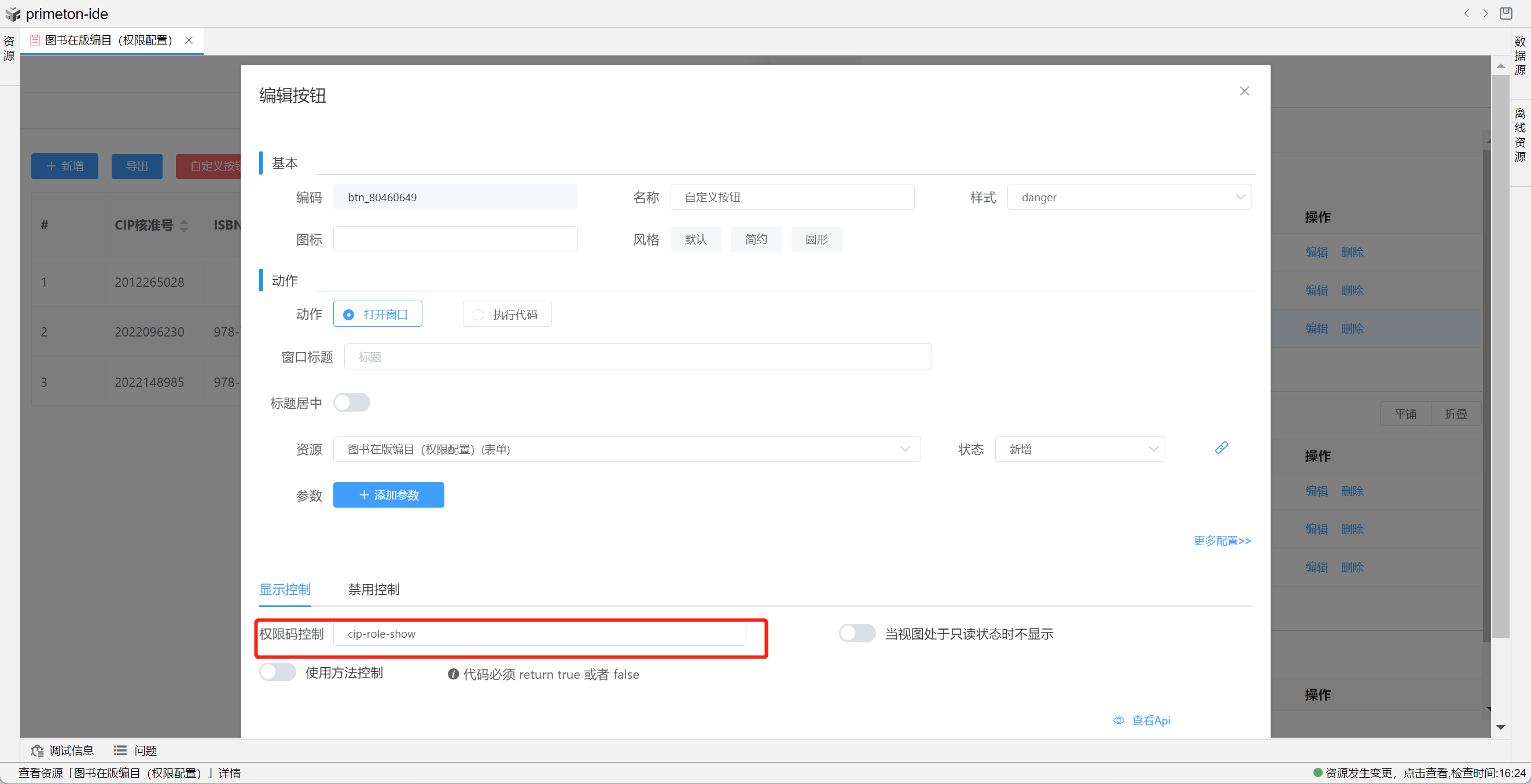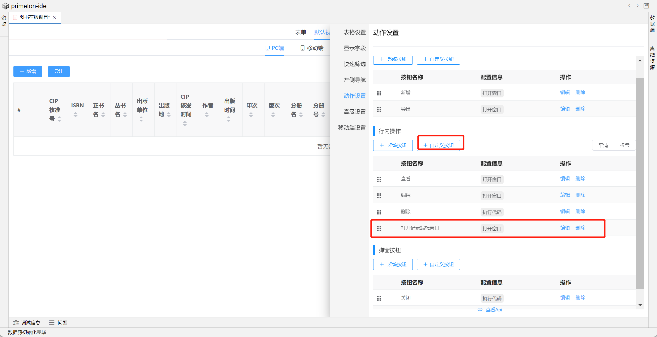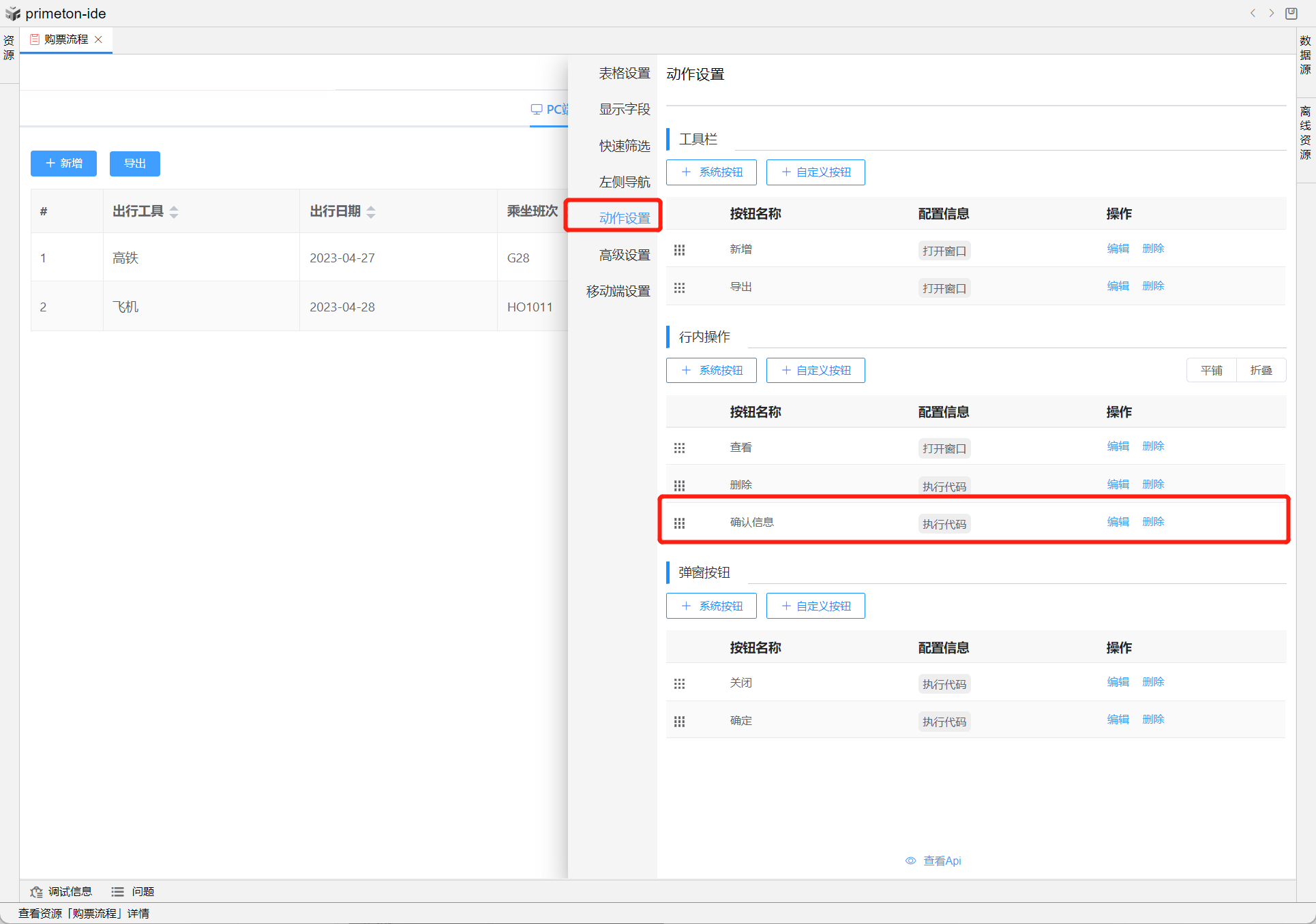方法二:在视图设置--动作设置-行内操作添加自定义按钮