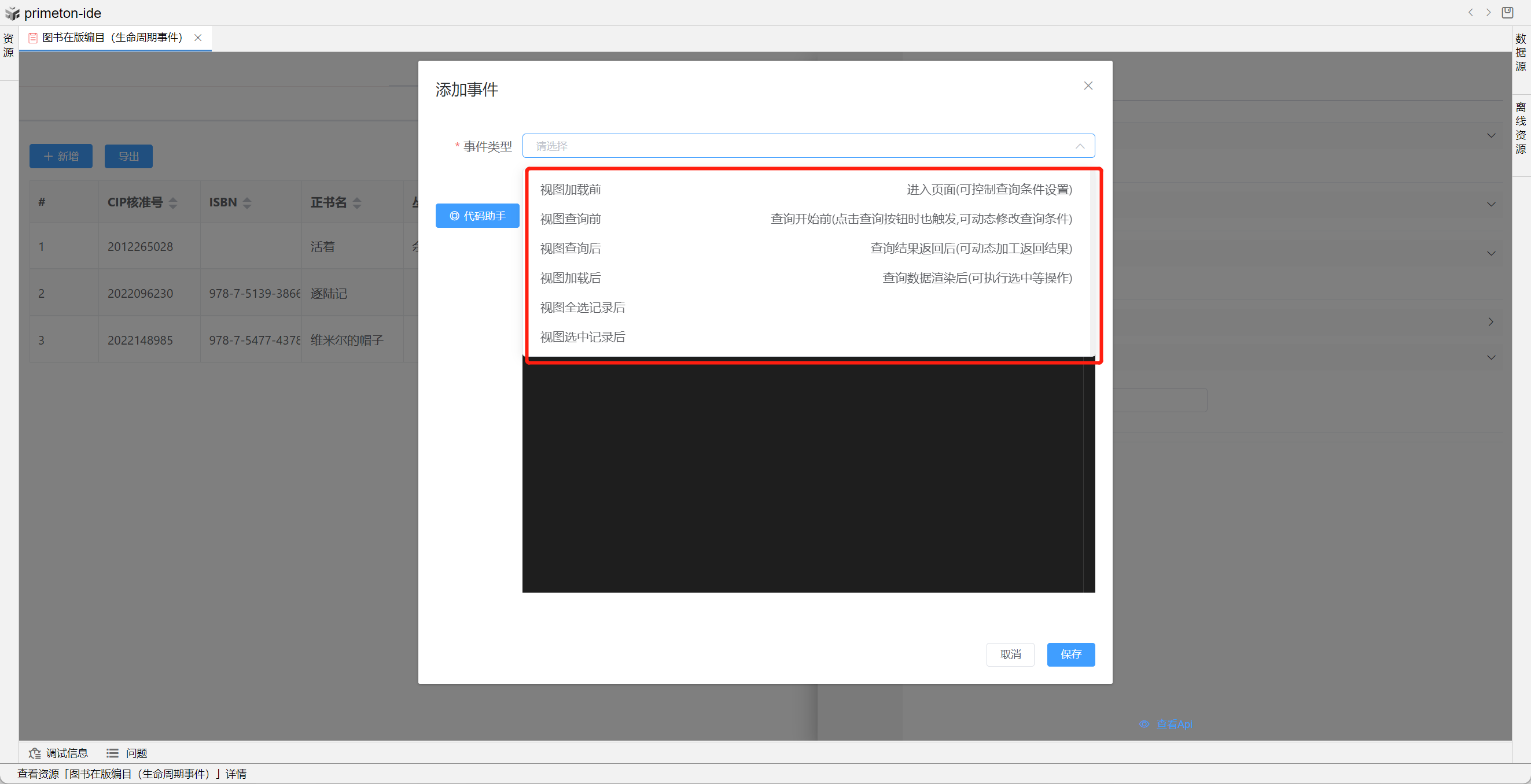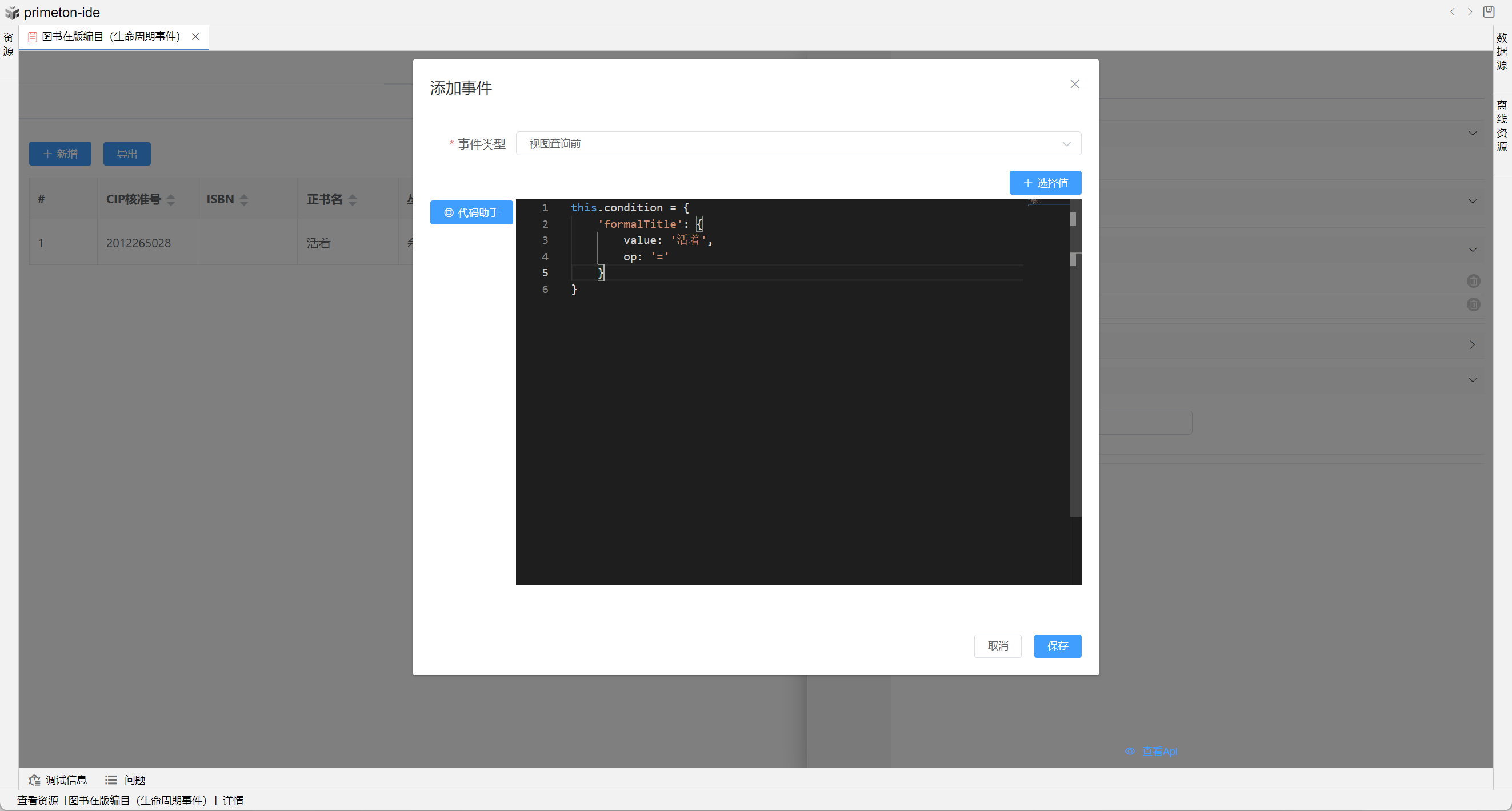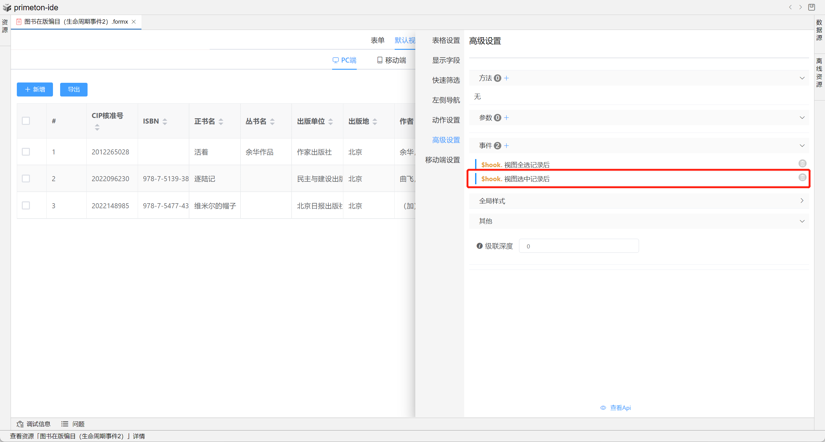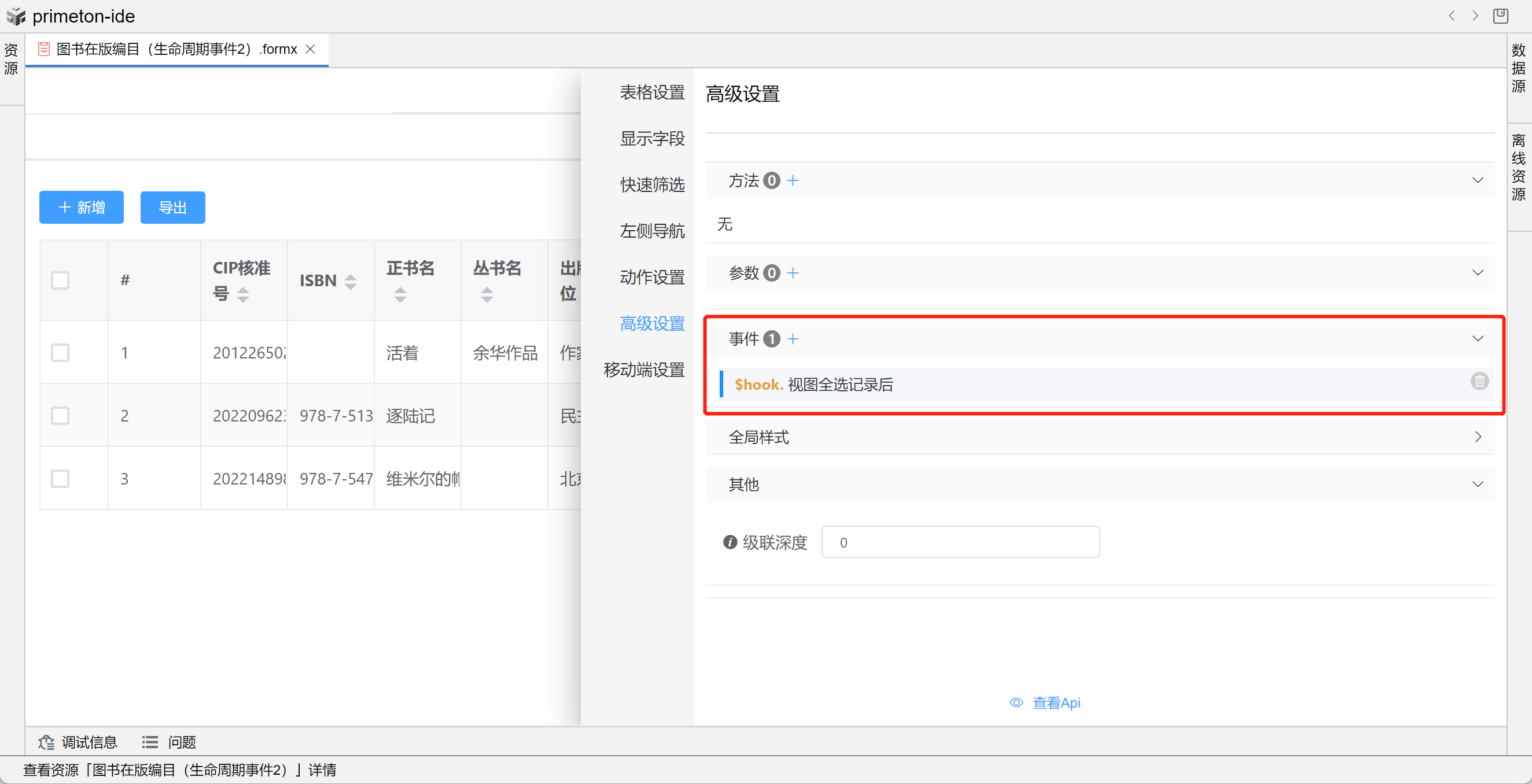 本部分将以"图书在版编目(生命周期事件)"和"图书在版编目(生命周期事件2)"为示例进行配置讲解