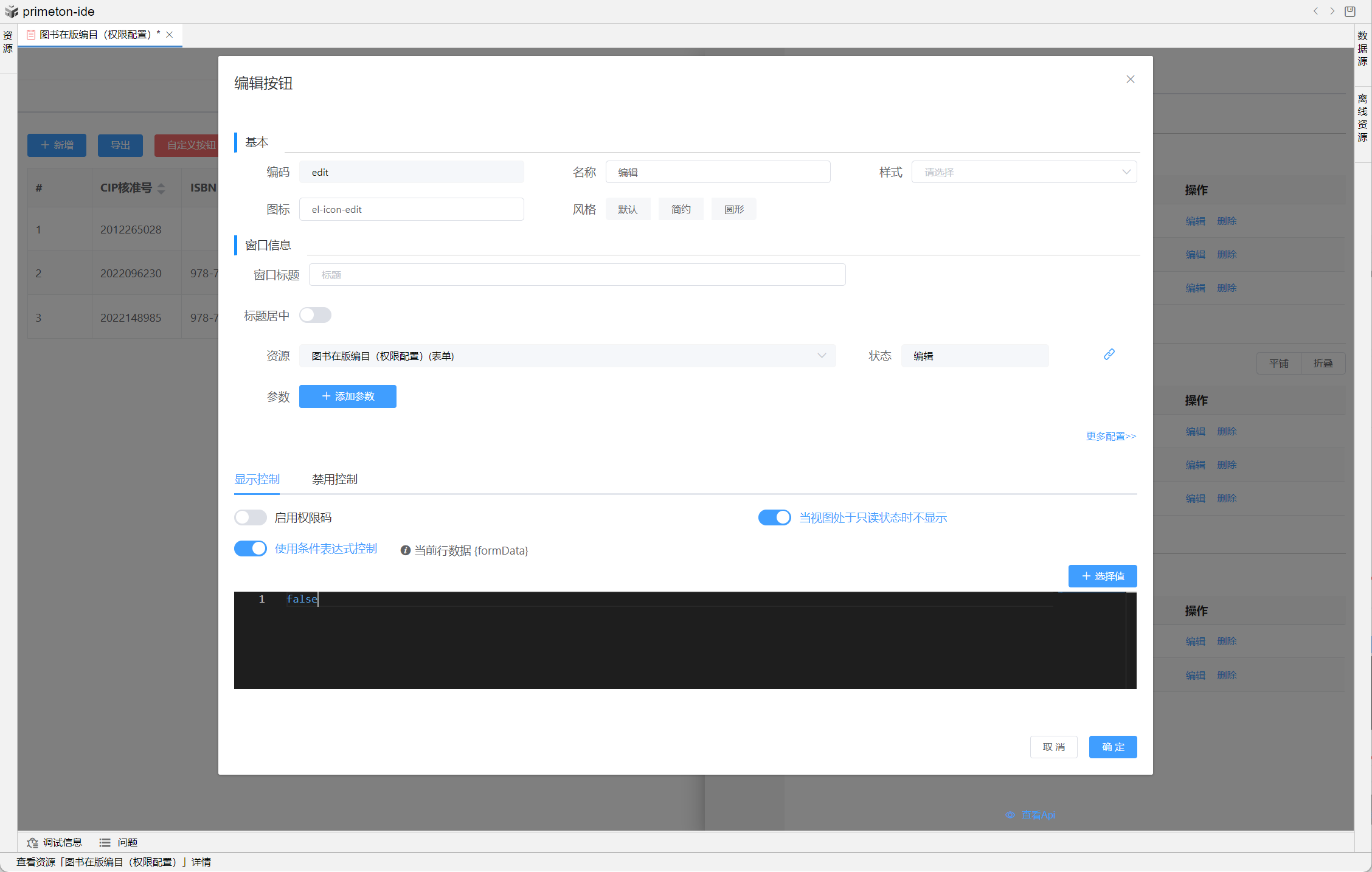 2. 在视图设置-按钮设置中添加行内自定义按钮,配置如下