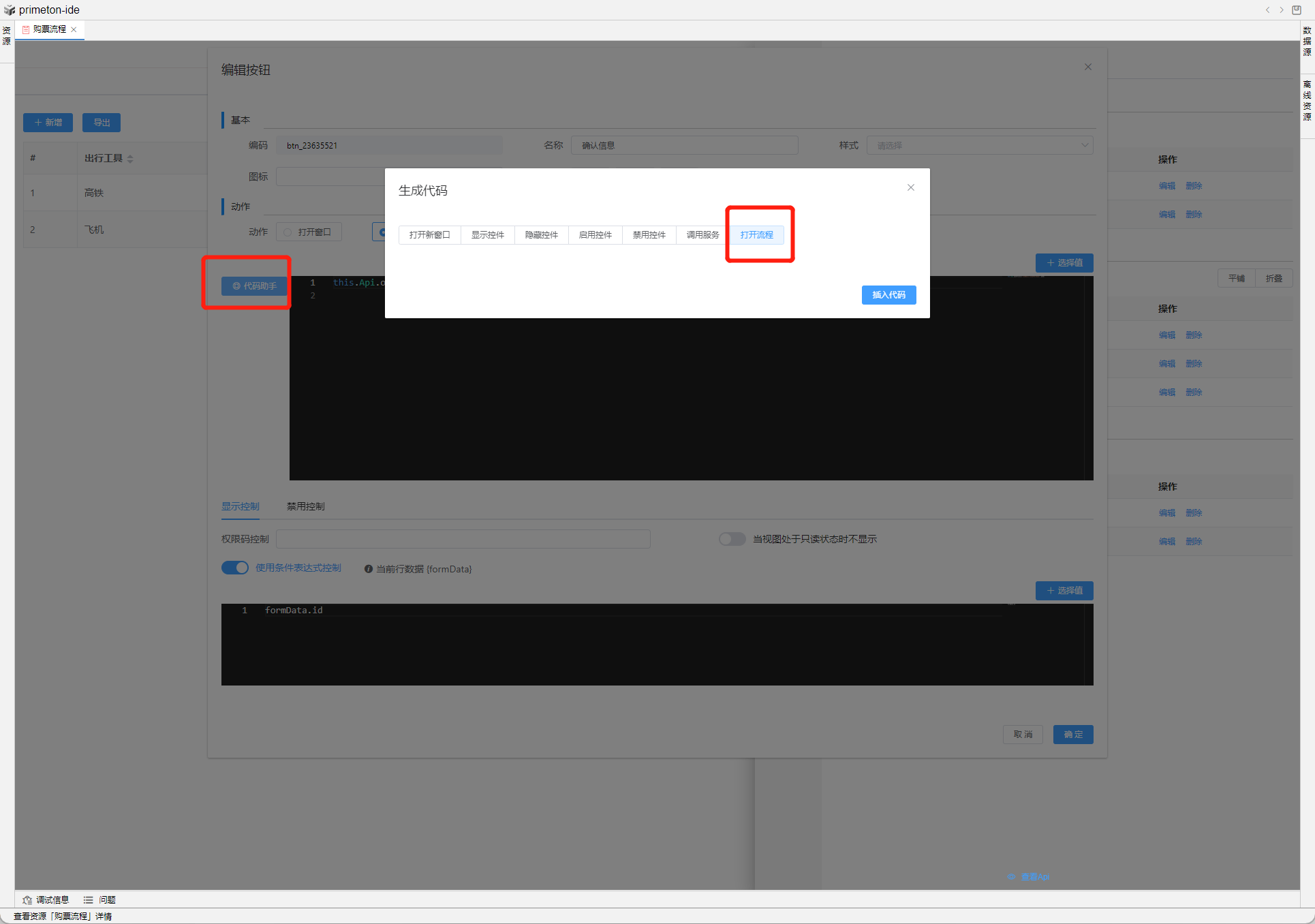 3.自定义按钮选择代码助手-打开流程,添加打开流程代码并添加参数pkId