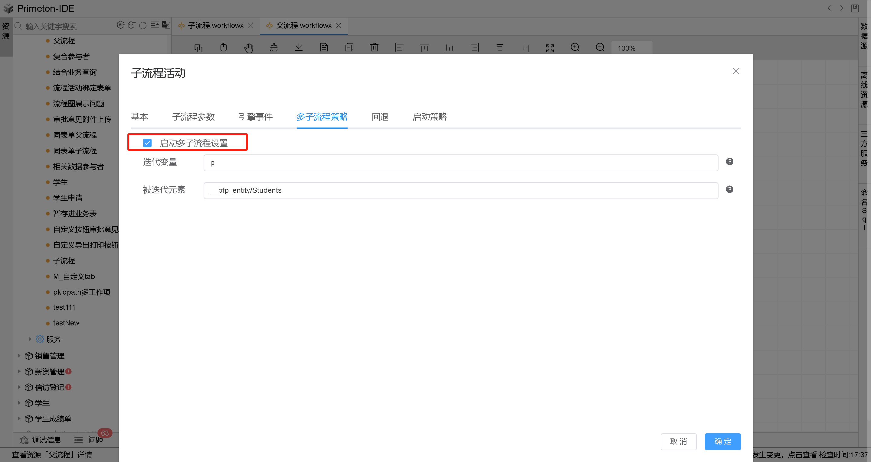发起父流程,当激活子流程活动实例时根据主流程表单中__bfp_entity/Students数组长度循环遍历生成对应个数的子流程实例。