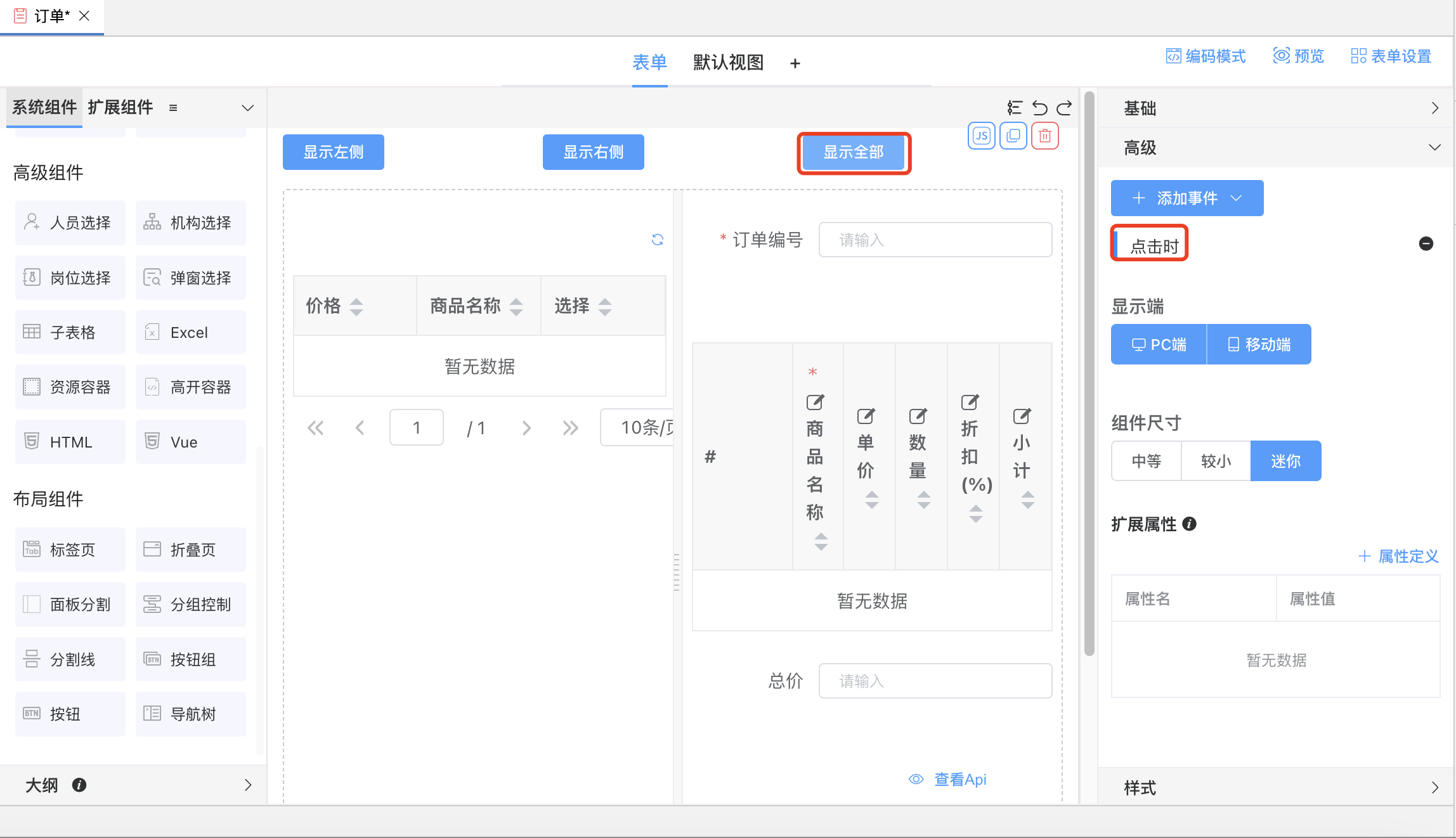 点击建立好的面板分割,在面板分割-高级中添加扩展属性,绑定v_show。
