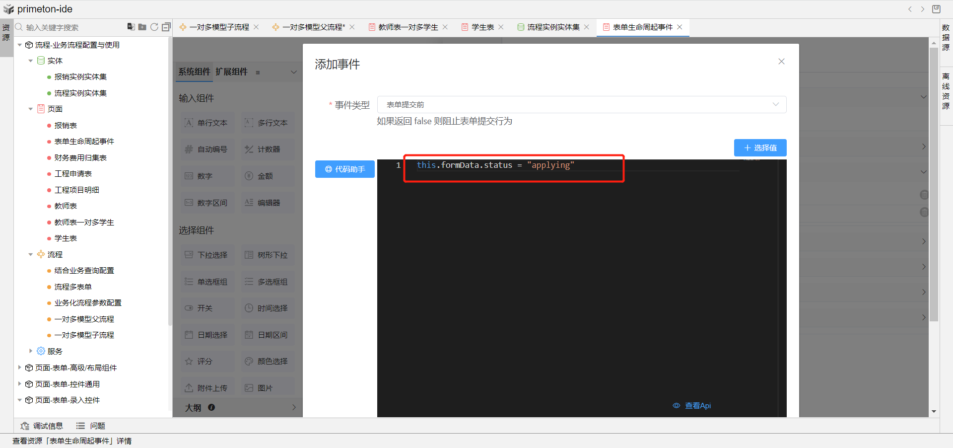 1.创建表单提交前事件,为表单实体formData中状态字段status赋值。