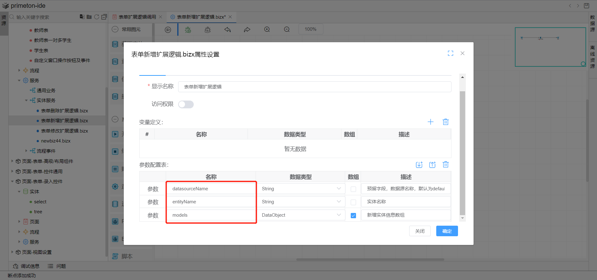 3.双击空白面板,打开逻辑流属性设置弹窗,可以看到该条逻辑流参数配置表中的参数详情。在表单新增时,调用该逻辑流会将表单中对应的参数传递进来。