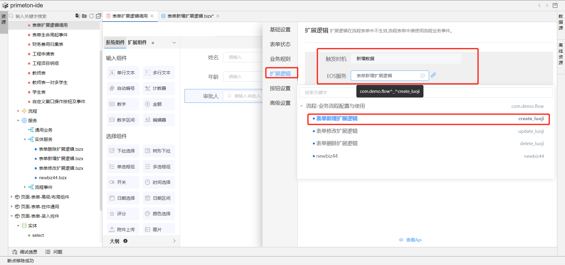 表单扩展逻辑是在新增、修改、删除表单时触发,调用EOS服务中的实体服务,完成数据操作,远程调用等一系列场景的功能。(注:扩展逻辑在流程表单中不生效,流程表单中请使用流程业务事件。)