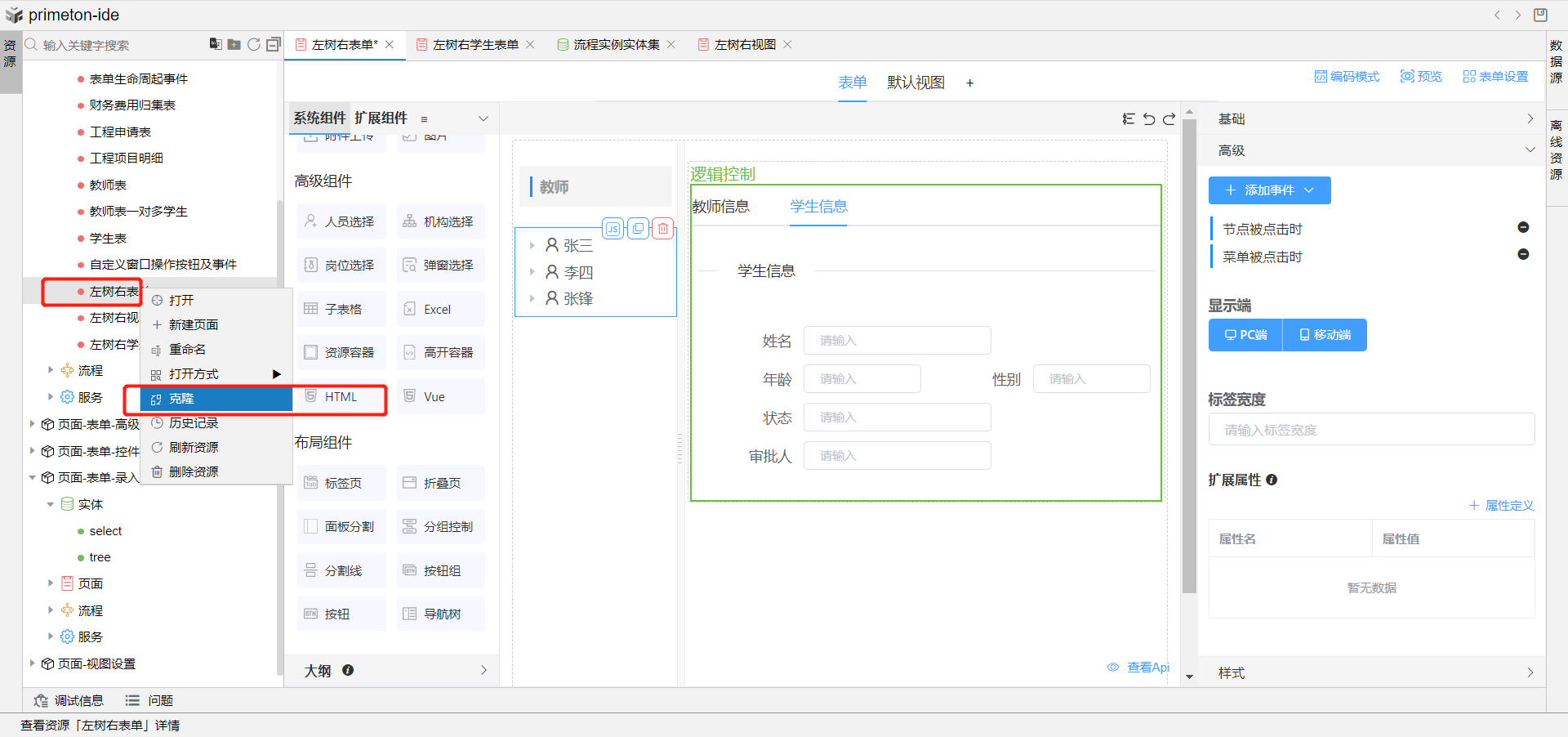 1.右键克隆左树右表单示例,表单名称为左树右视图。