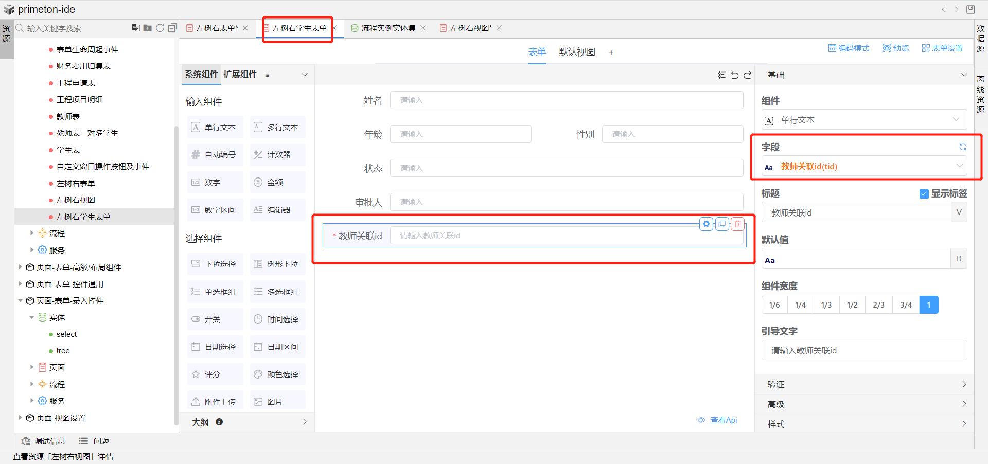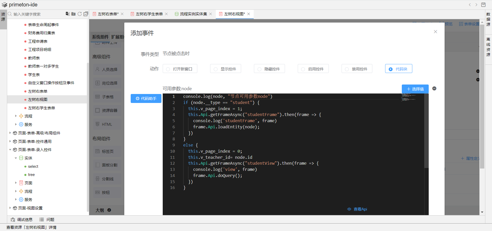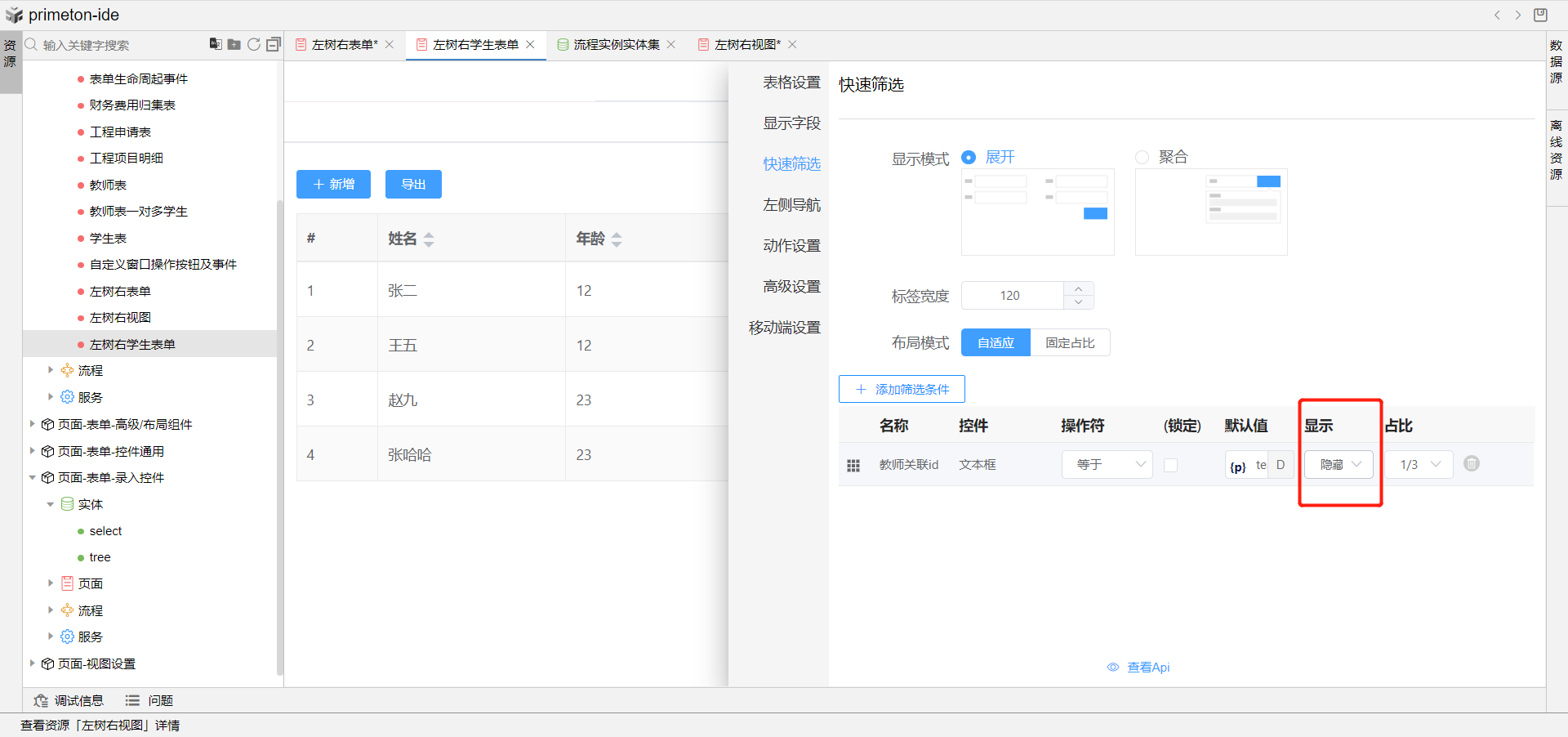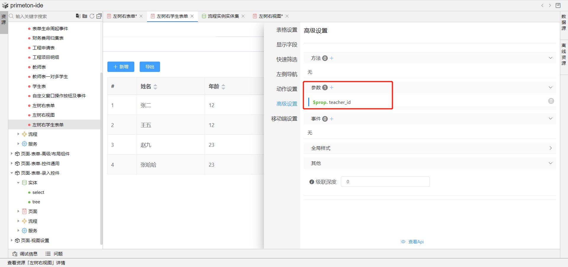 7.完成上述配置,即可预览左树右视图成果展示,点击左侧树教师信息,即可在右侧展示该教师下得学生信息视图。