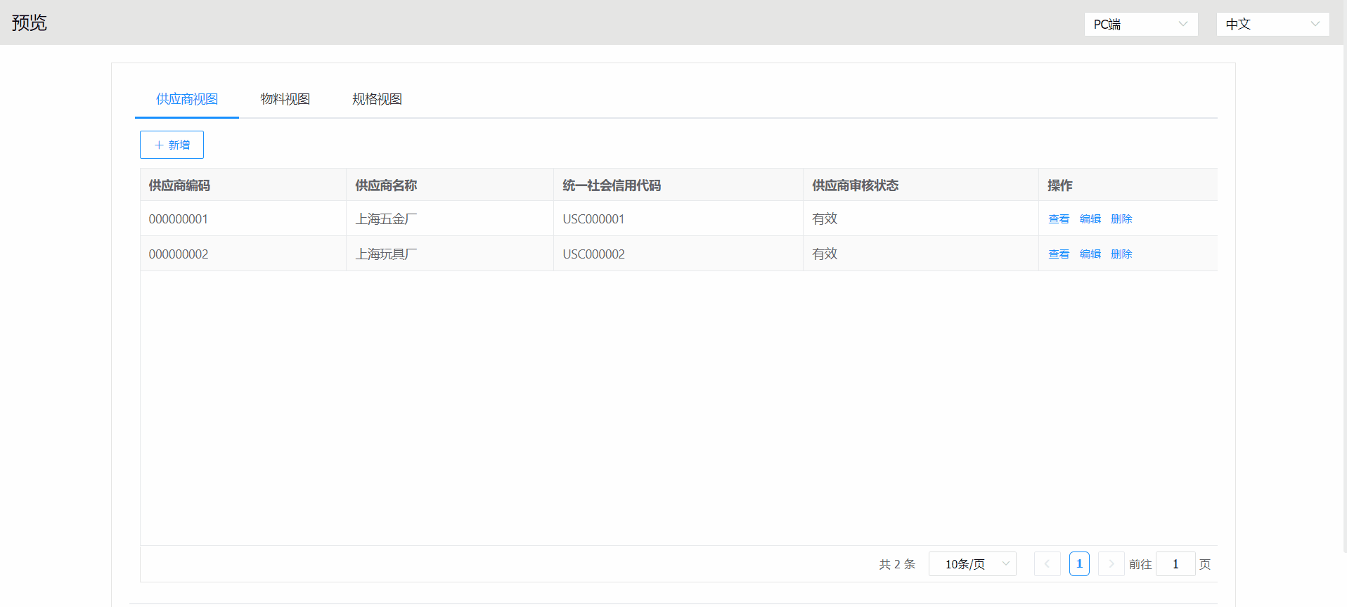 添加三个标签页:供应商视图、物料视图、规格视图。