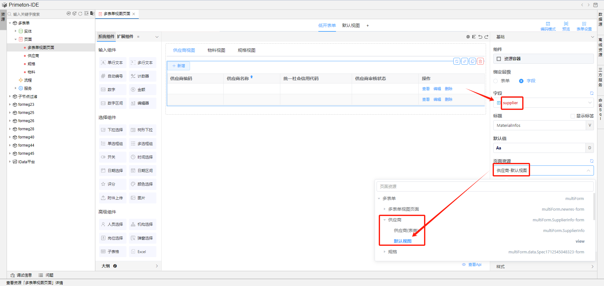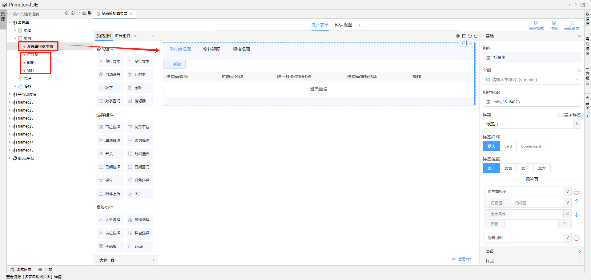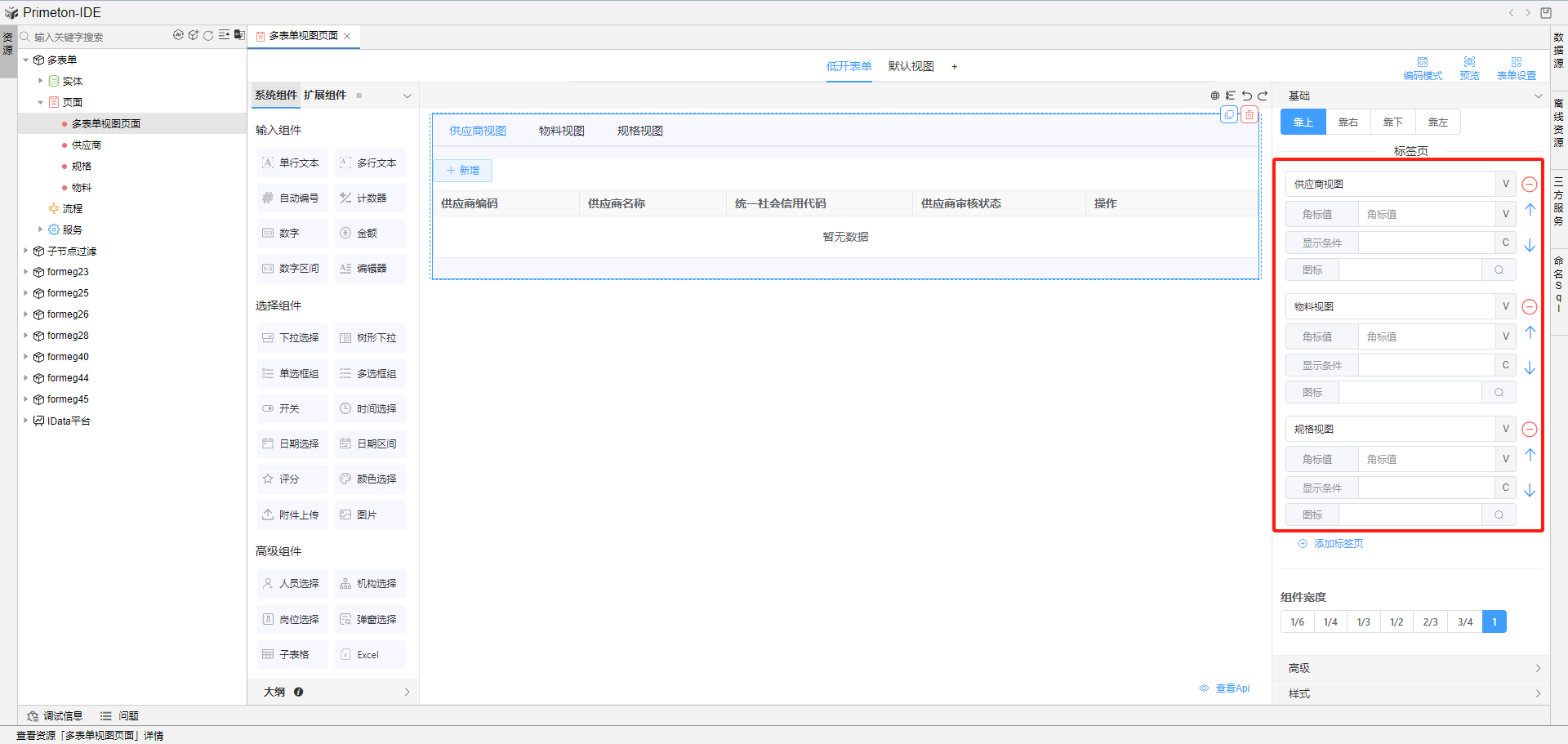 准备三个页面:供应商、物料、规格, 克隆其中一个页面修改为多表单视图页面,页面内清空组件,添加标签页组件。