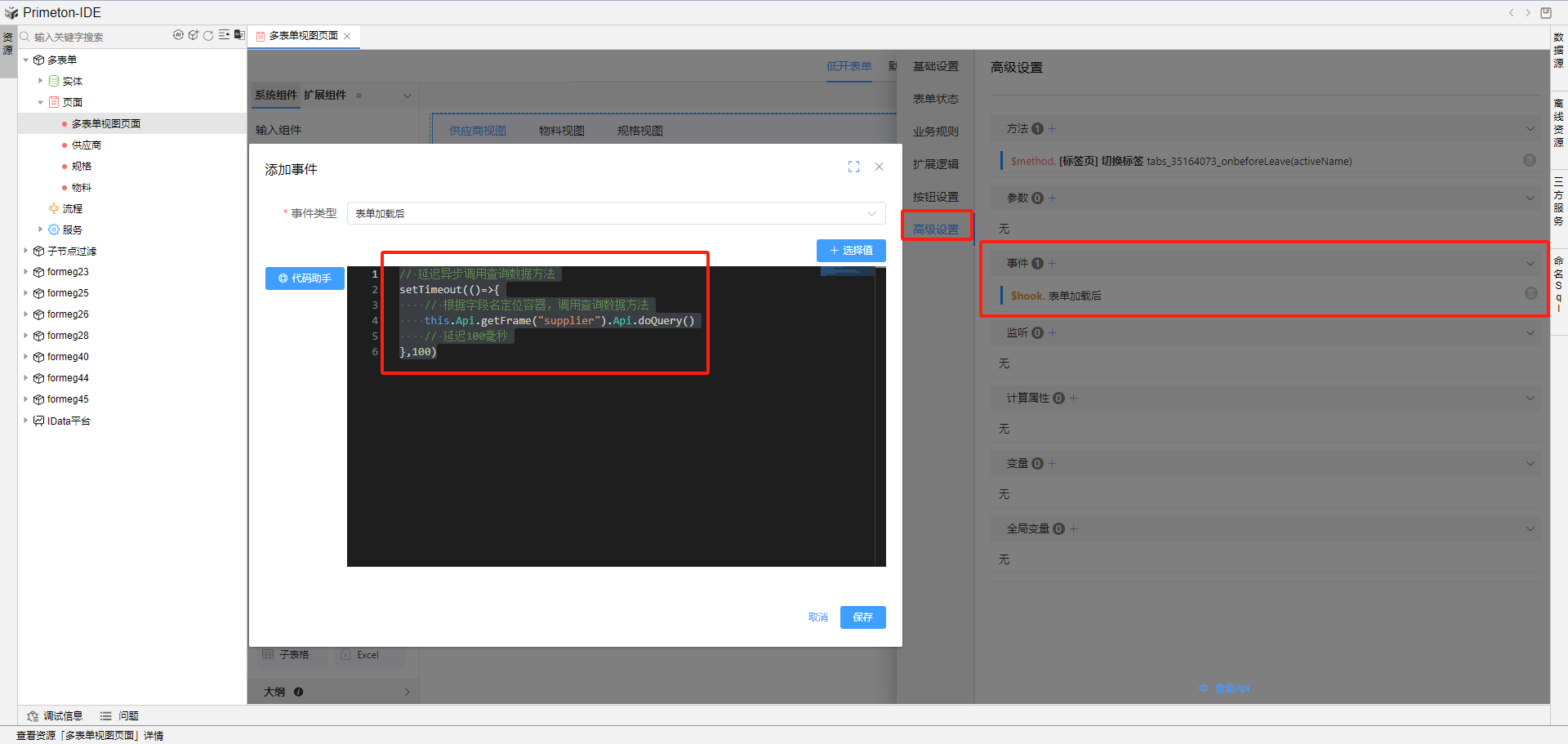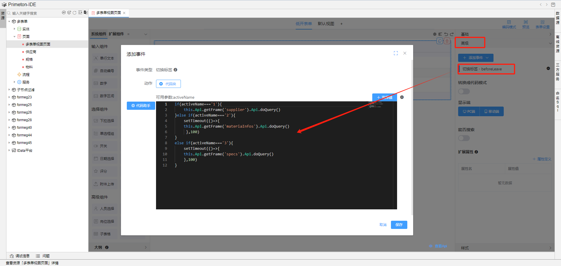 点击标签页组件,选择高级-添加事件-切换标签,书写js代码。