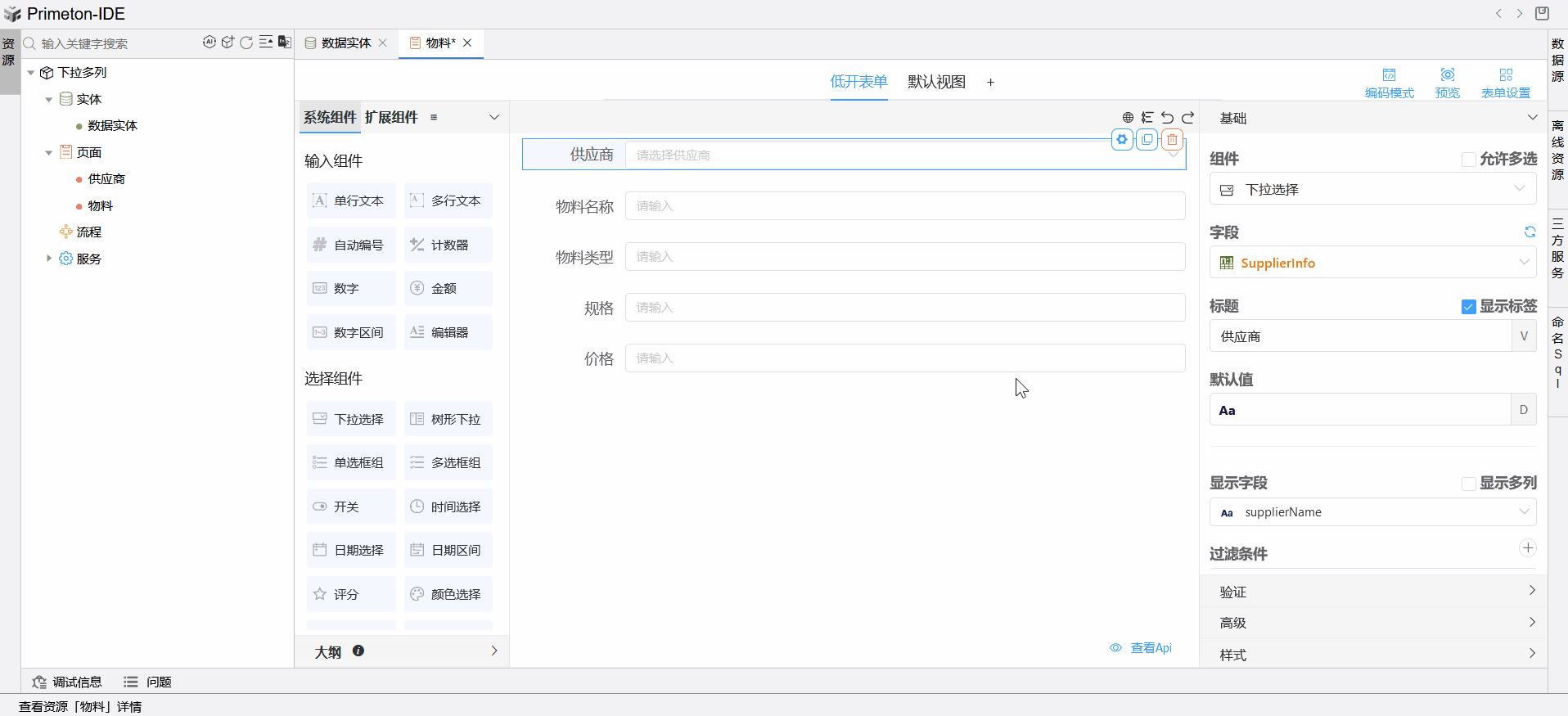 在物料与供应商关联的表单中,供应商下拉组件可以同时显示供应商名称和供应商统一信用代码。