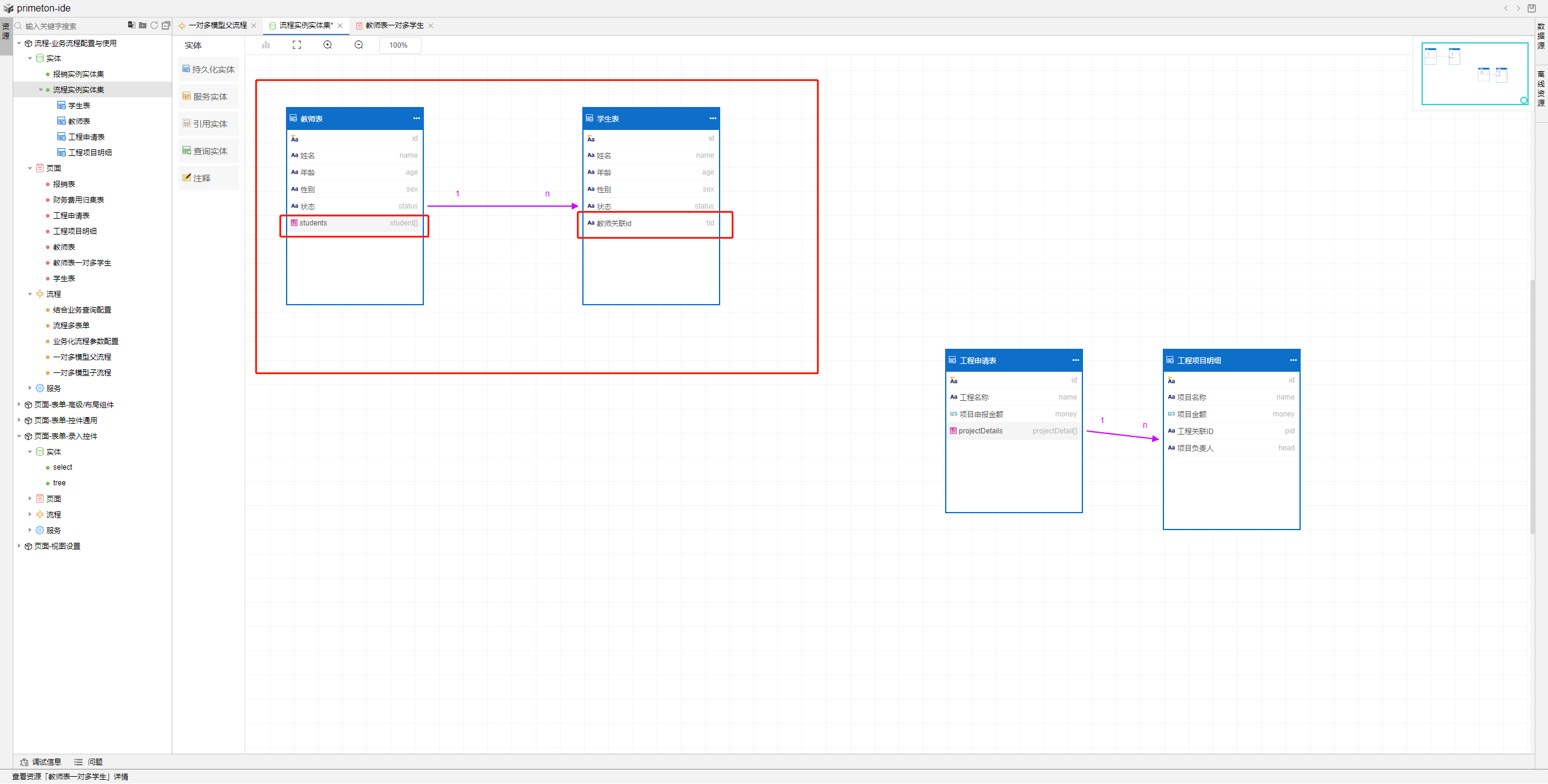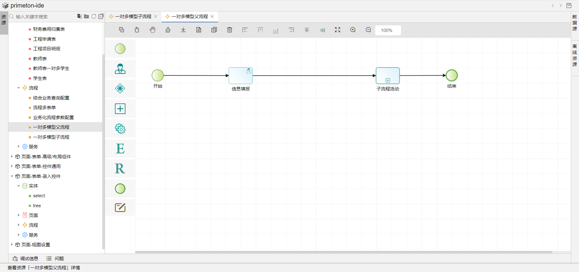 3.根据数据实体创建父流程表单页面,1端作为主流程页面,需要拖选子表格组件,绑定n端默认视图,子表格绑定数据实体n端字段,编辑模式选择弹窗,保存主流程。