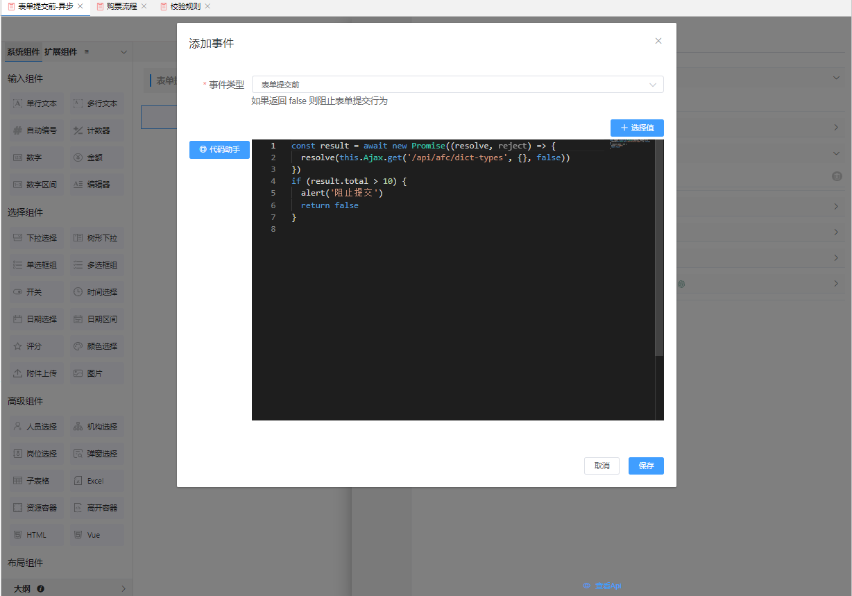 步骤1.可以在右侧配置项高级中添加事件选择allowSelect;