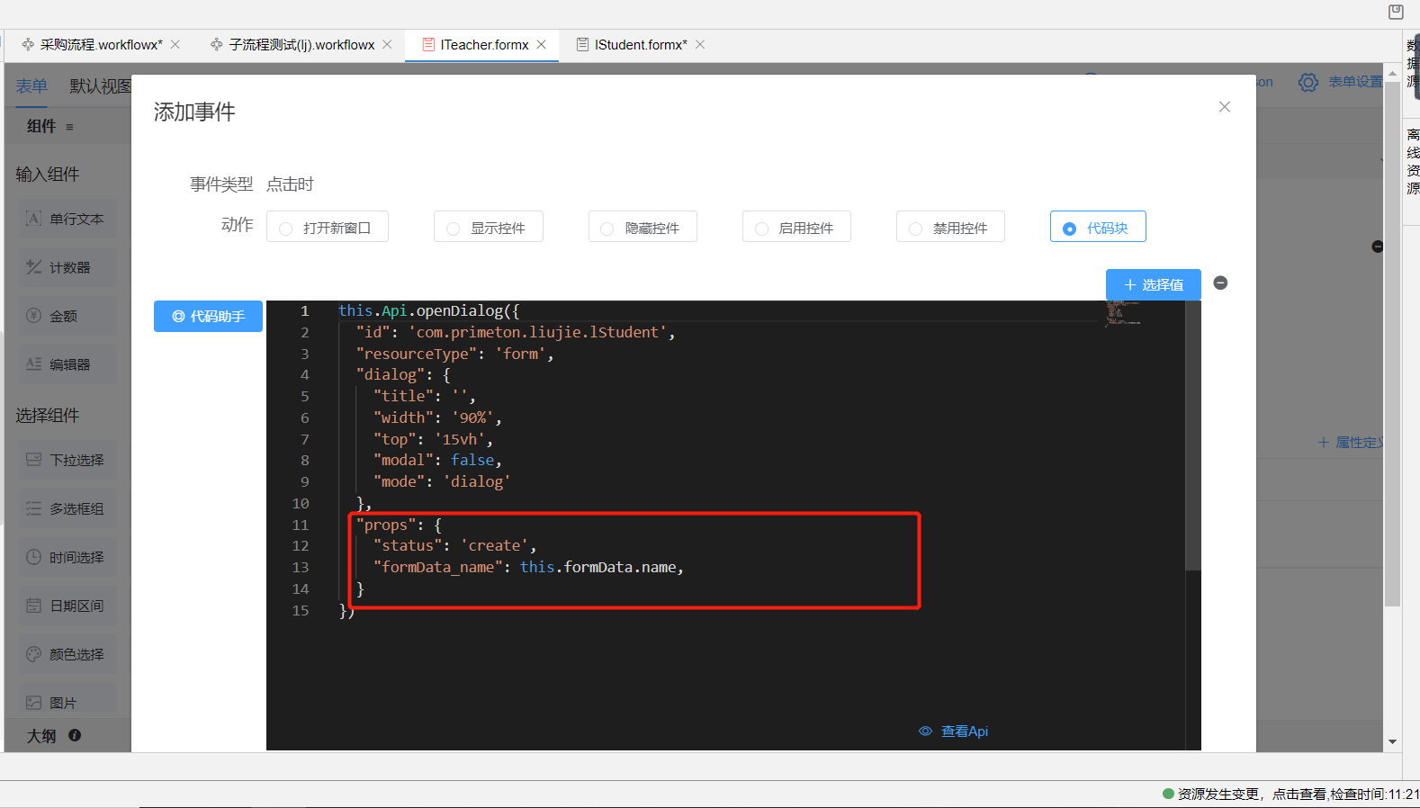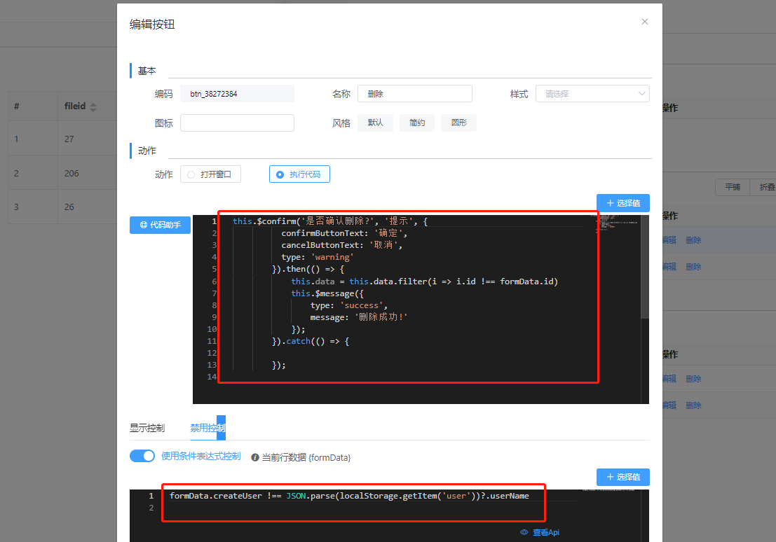 步骤2. 在高级里添加事件(菜单被点击时),选择代码块,可以获取到当前点击节点的数据action(菜单的action类型)和node