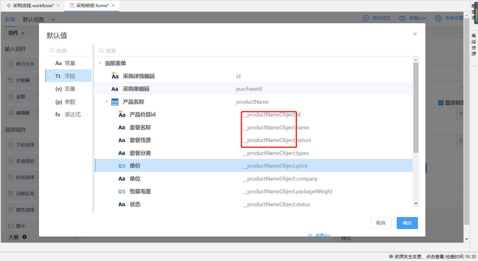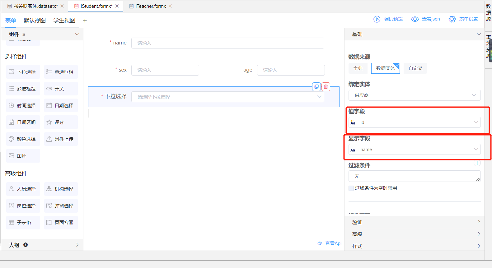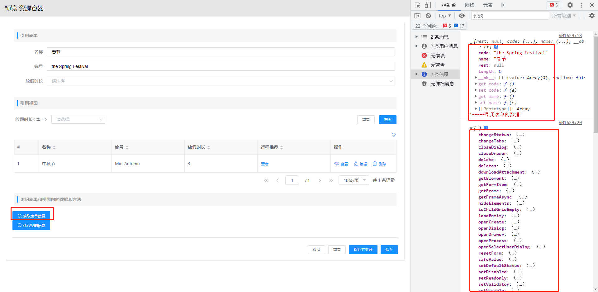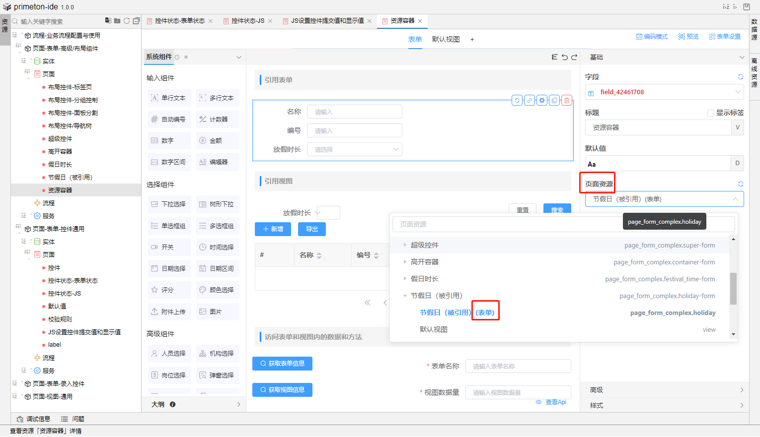 前提:先加载<假日时长>表单,更新视图,并添加视图数据;再更新<节假日>表单,其中控件<放假时长>为下拉框,数据来源绑定的是<假日时长>的实体