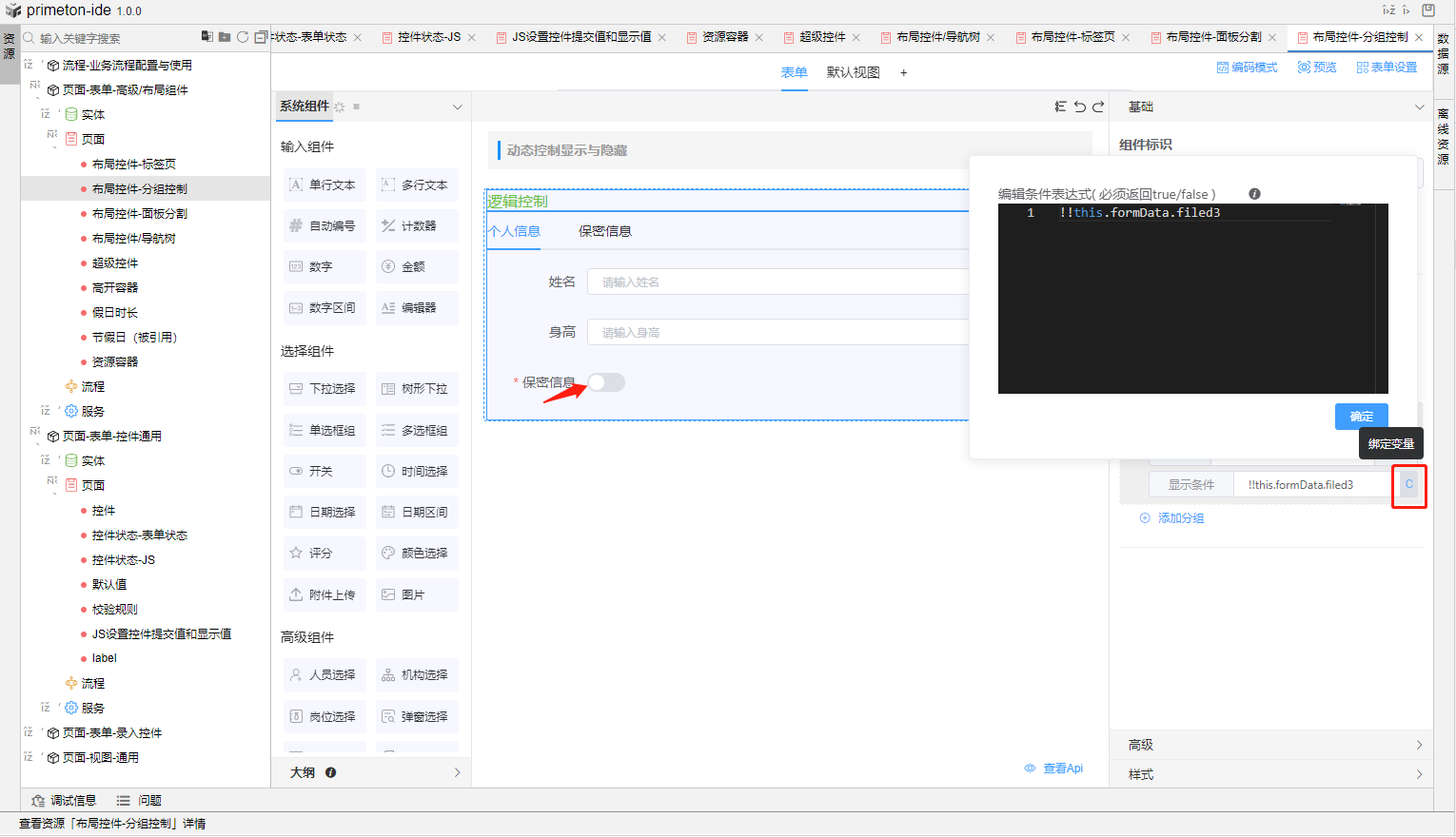 步骤5. 右侧资源容器组件 的 页面资源绑定<导航树视图>,高级的扩展属性添加参数rest,绑定的值为新建的变量(v_currentnode_id)