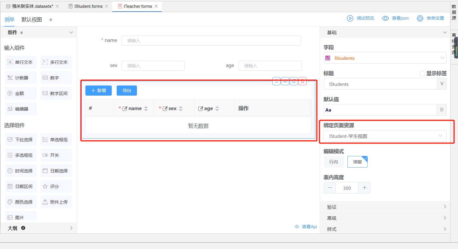说明:子表格一般 绑定字段为实体1-》n自动生成的1:n数组;