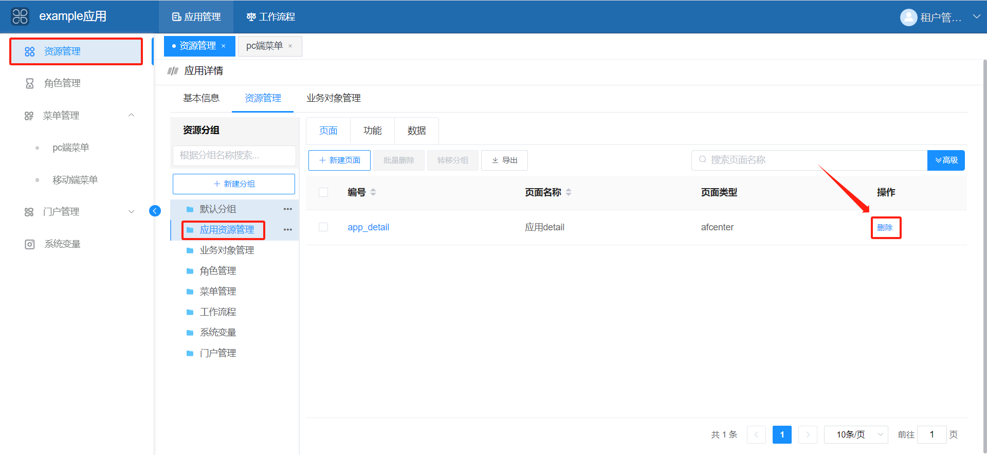 在应用管理页面,点击菜单管理-pc菜单管理,把pc端菜单树下的菜单,按叶子菜单到非叶子菜单全部删除。
