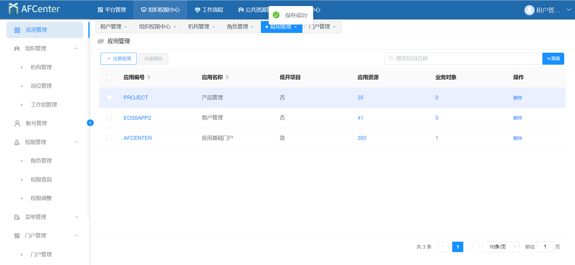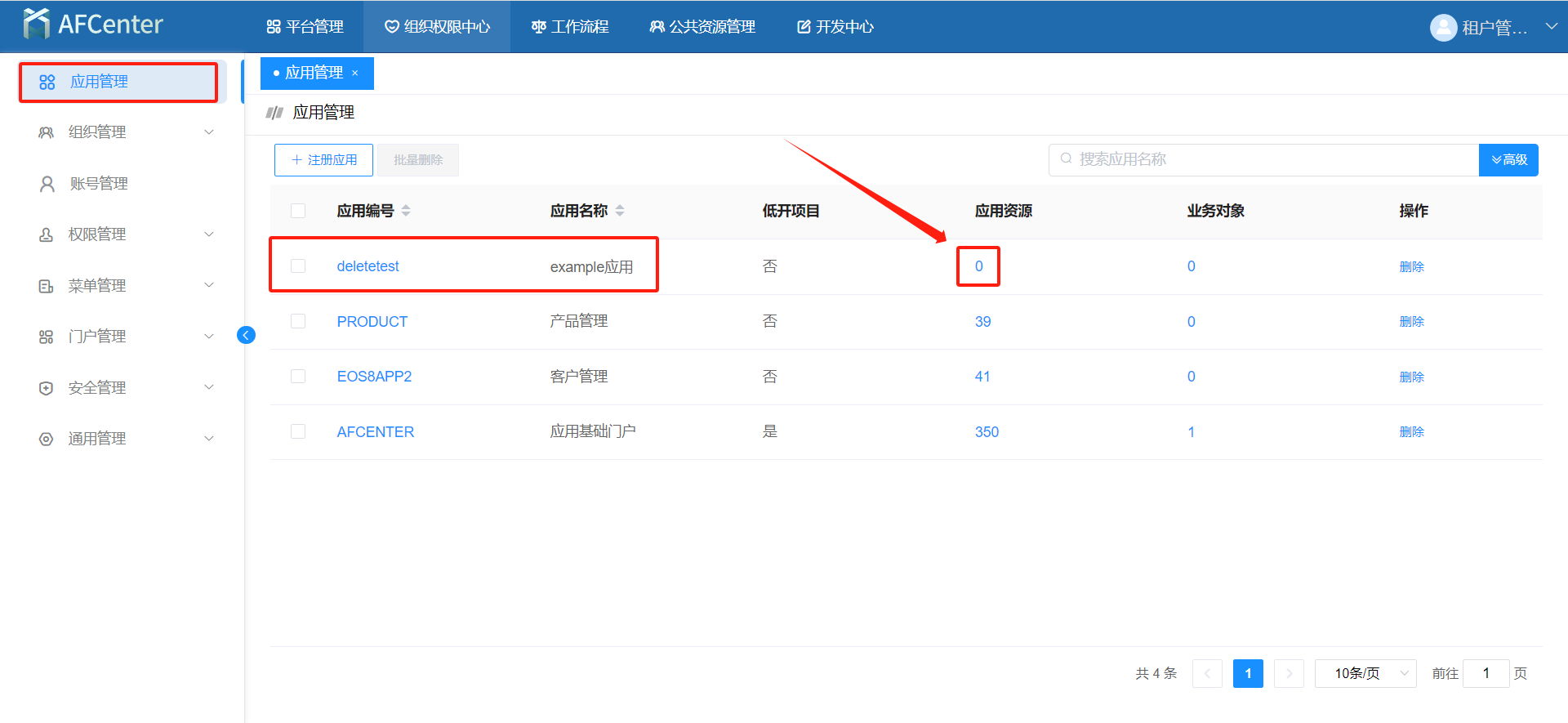 删除完成后,在组织权限中心-应用管理中,查看到该应用应用资源显示为0。