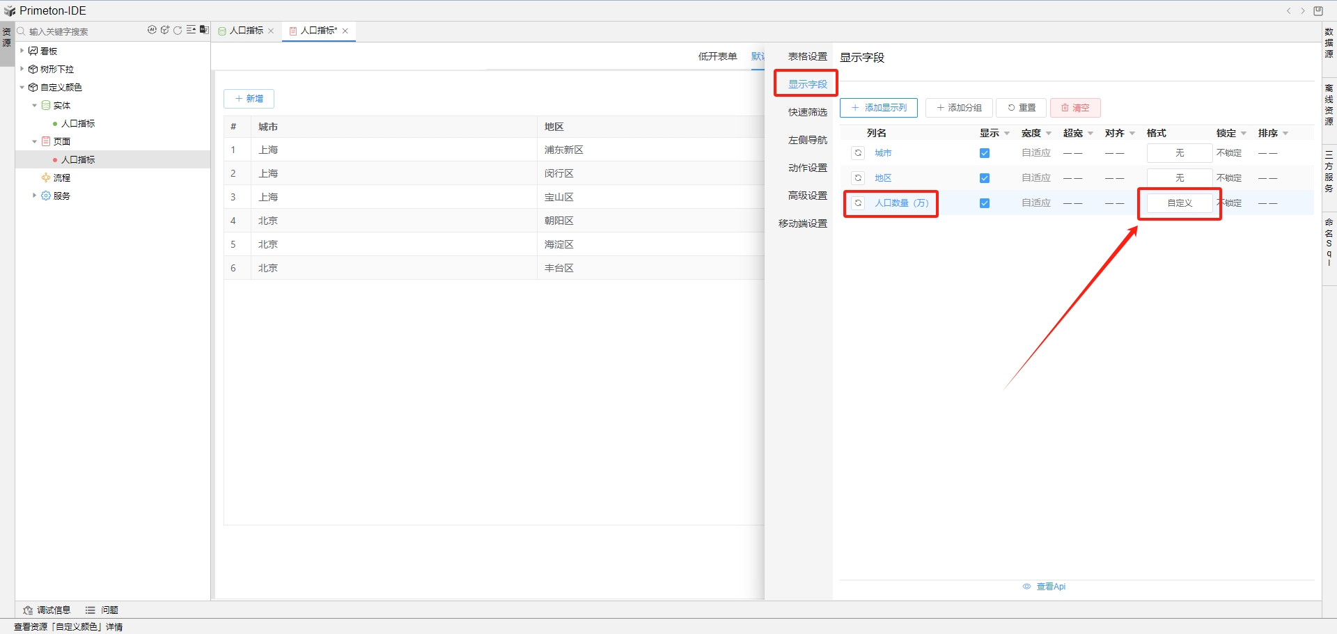 点击并加载视图,在视图设置-显示字段内,切换列名为人口数量(万)的格式自定义。