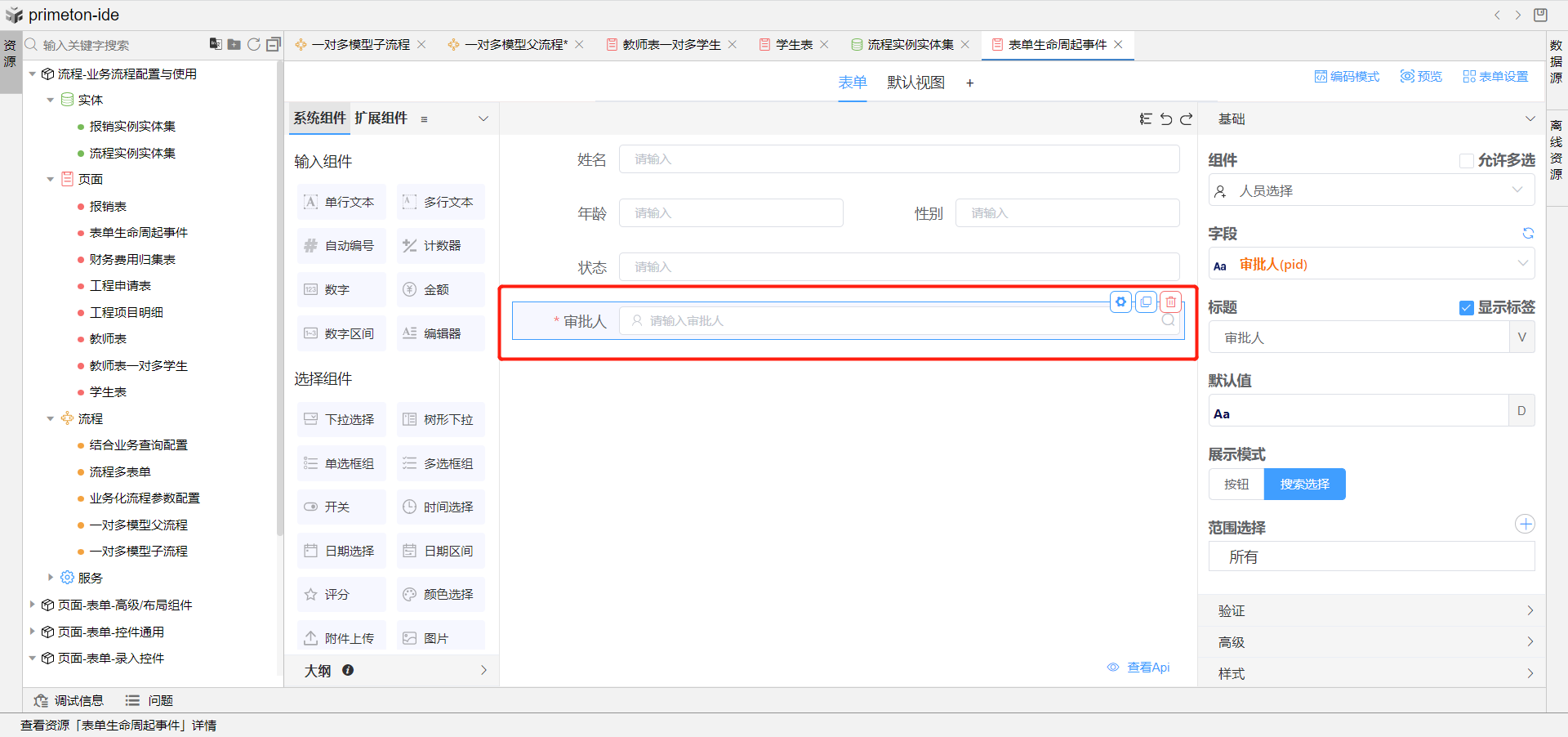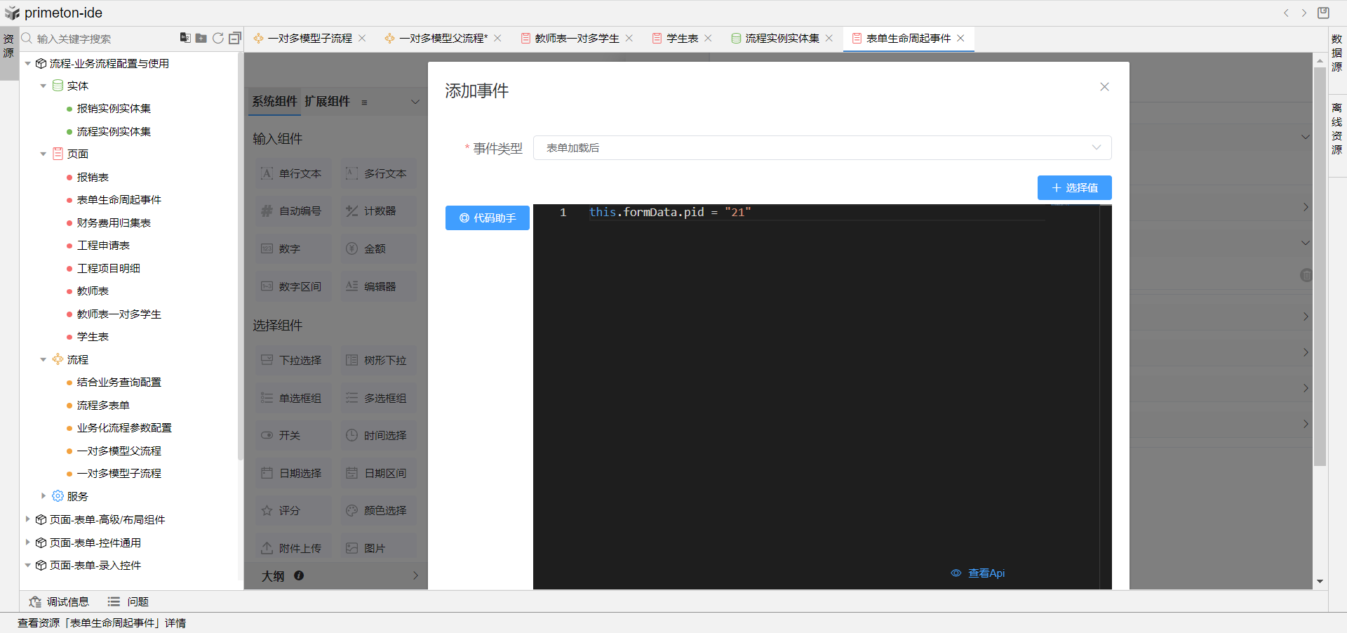 表单加载后时候常用于初始化表单数据。例如:新增数据时设置审核人(选人组件)为张三(也可以调用后端接口拿到数据为组件绑定的字段赋值)。