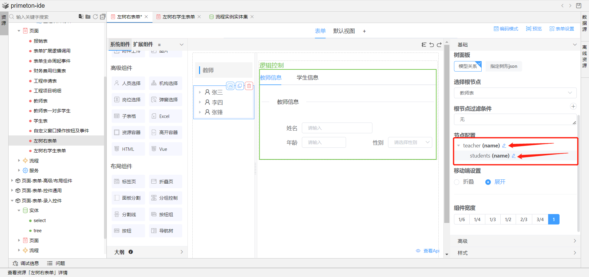 使用场景:表单页面布局划分,左侧树形导航展示教师姓名列,点开后下方展示教师下的学生姓名列,右侧展示教师信息详情表单,点击学生姓名右侧切换展示学生信息详情表单。导航树上可做新增、删除学生操作。