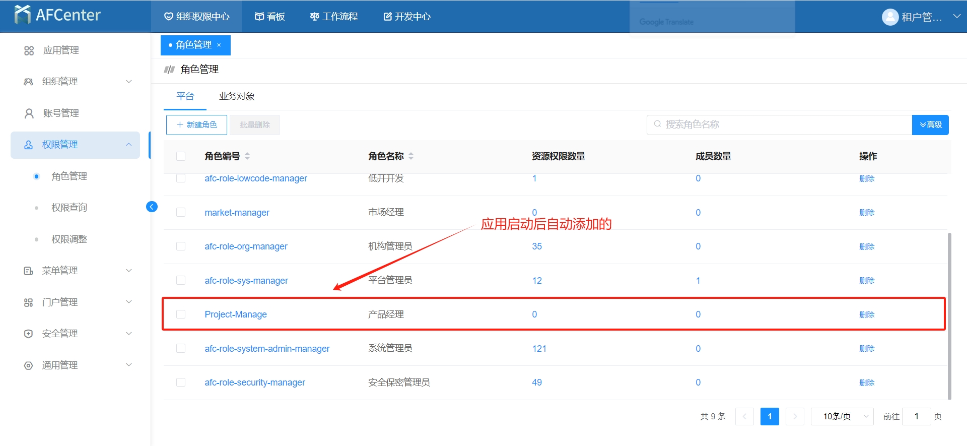 本地高开应用,通过远程调用接口的方式,在“AFCenter“中创建“产品经理”的角色。
