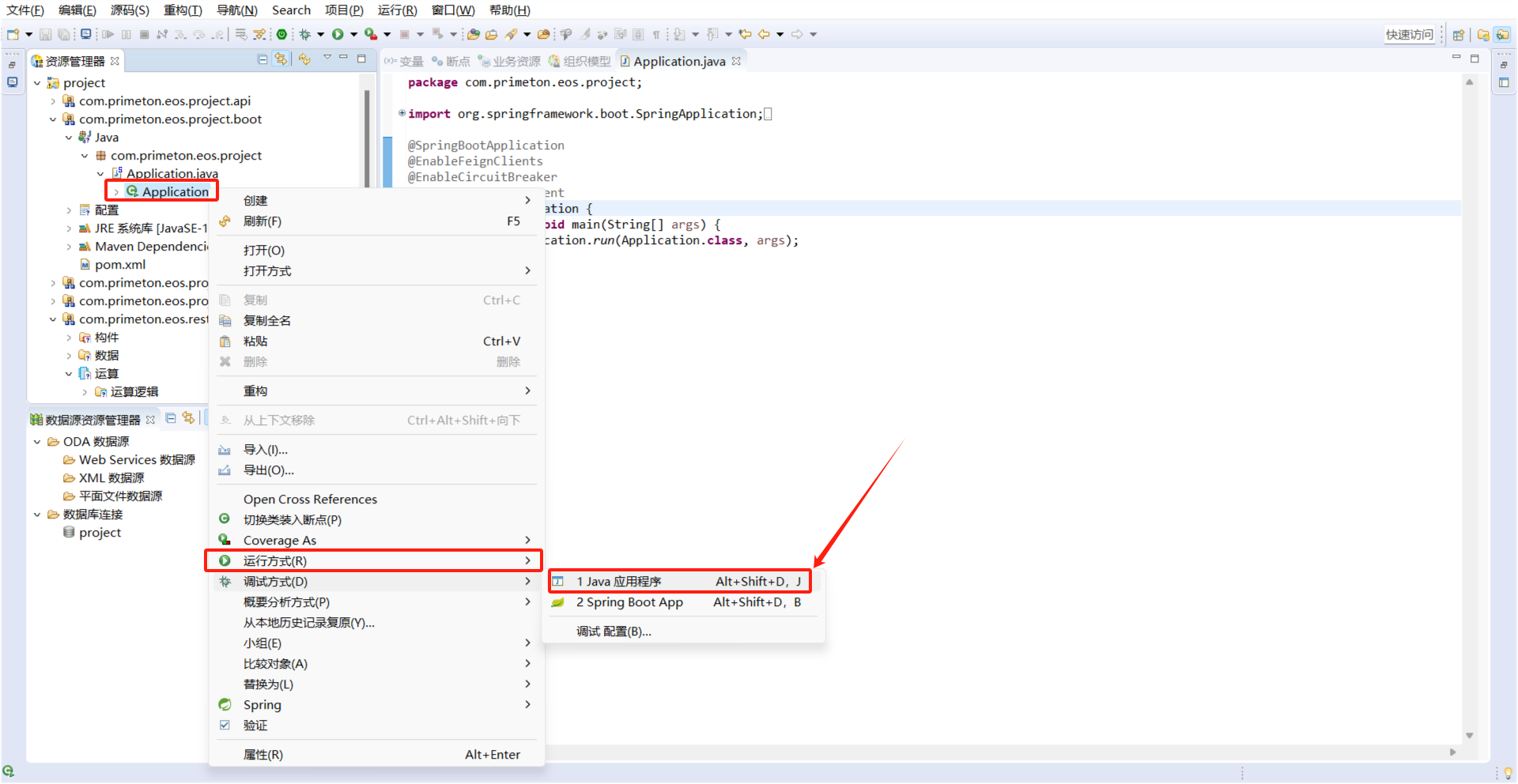 通过com.primeton.eos.project.boot-Java-com.primeton.eos.project-Application.java类-运行方式-Java应用程序,启动应用。