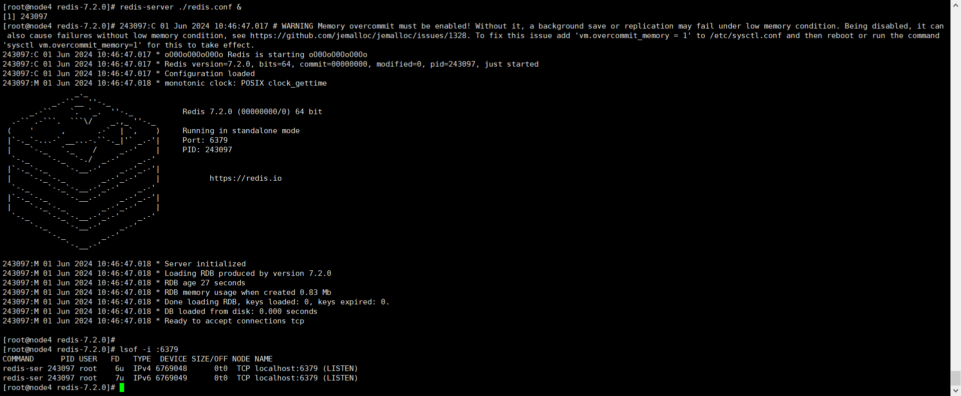 cd /usr/local/redis/redis-7.2.0 redis-server ./redis.conf & lsof -i :6379