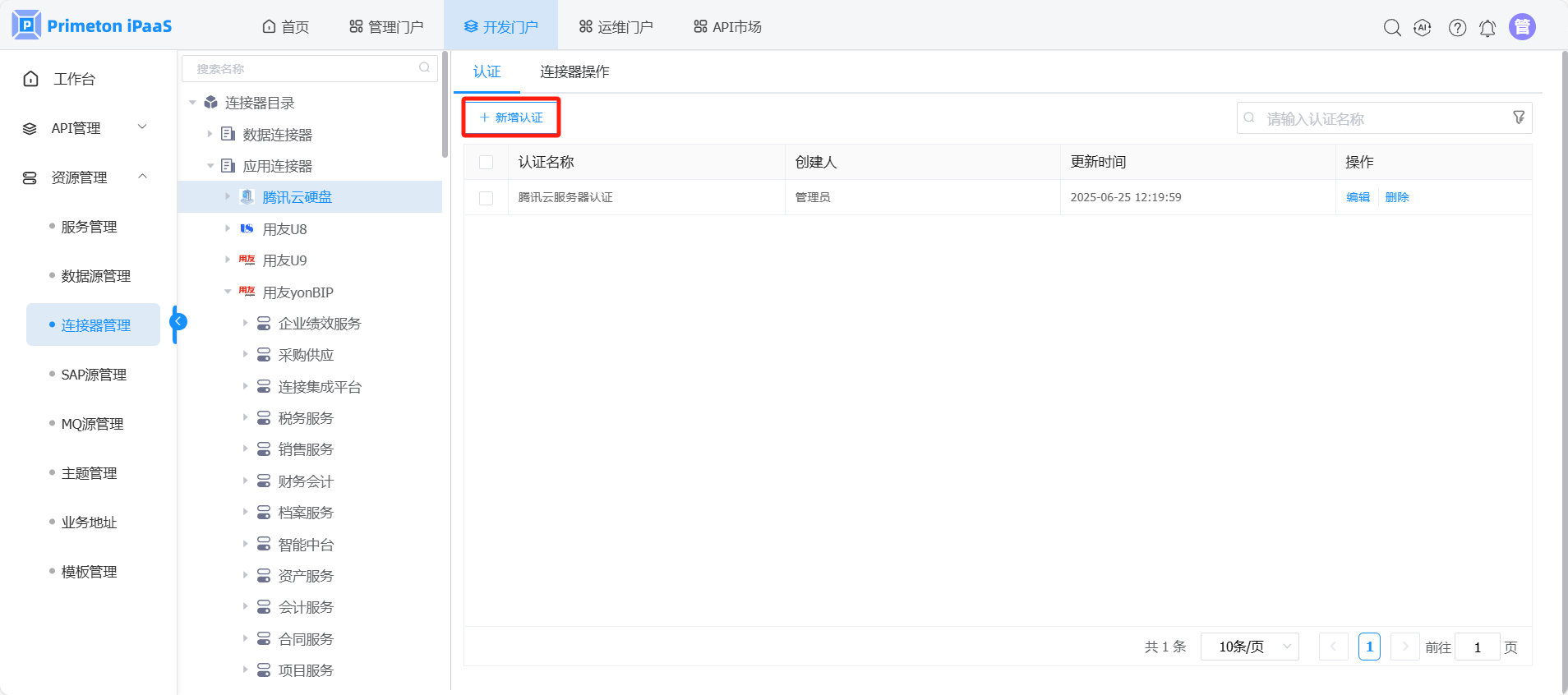 开发人员登录系统,进入开发门户,点击菜单“资源管理“ >“连接器管理” ,右侧区域显示 “连接器管理”界面。