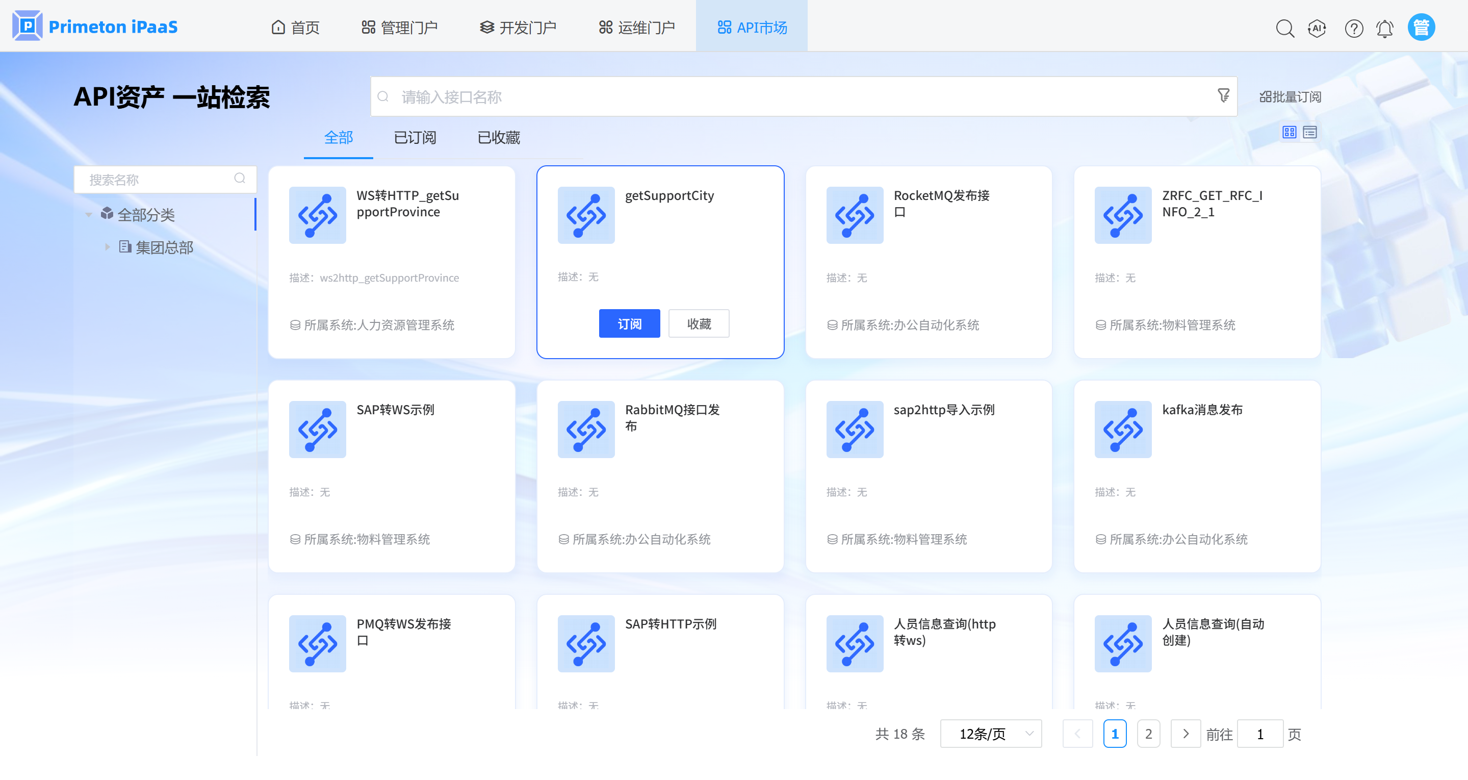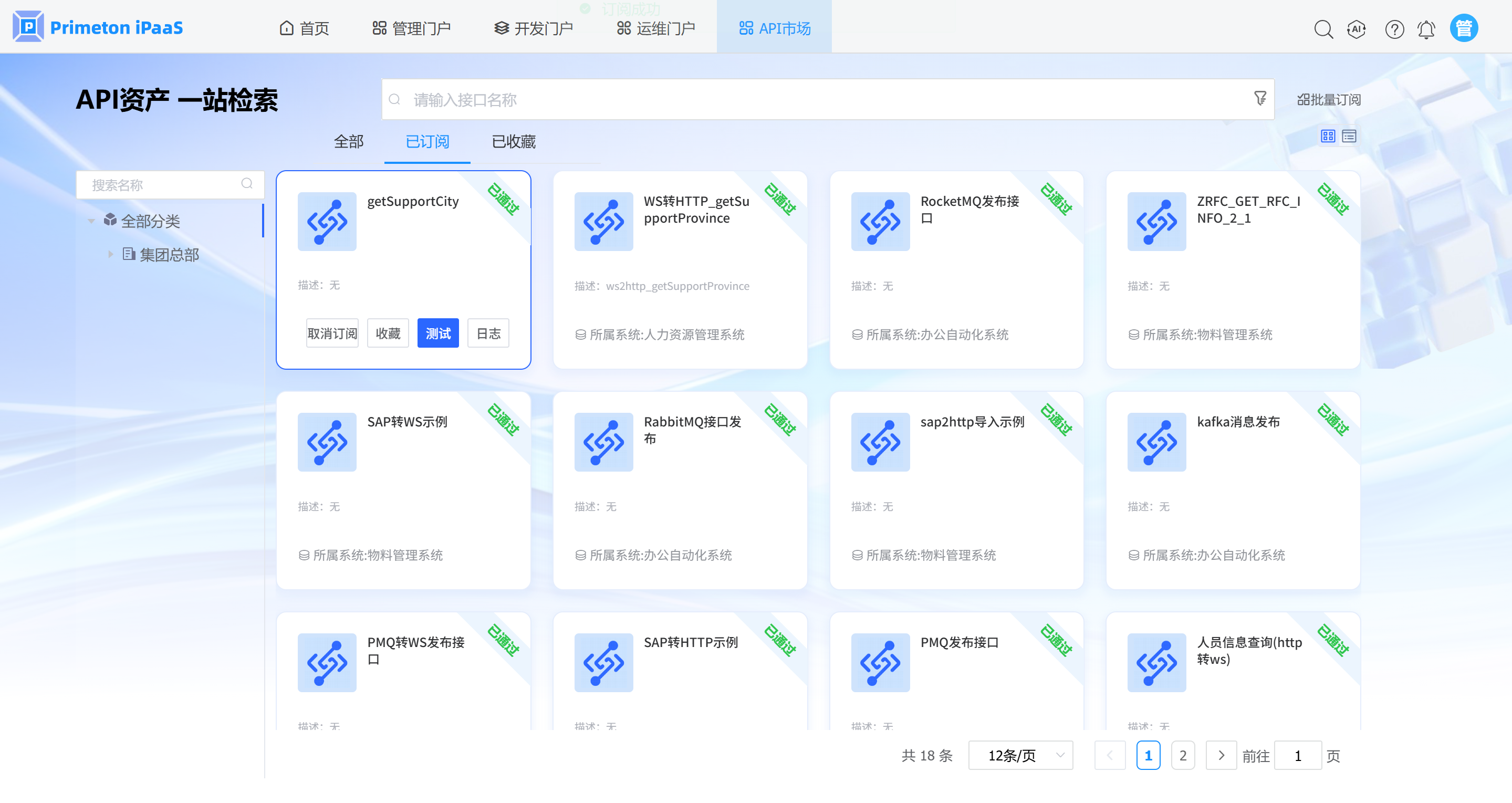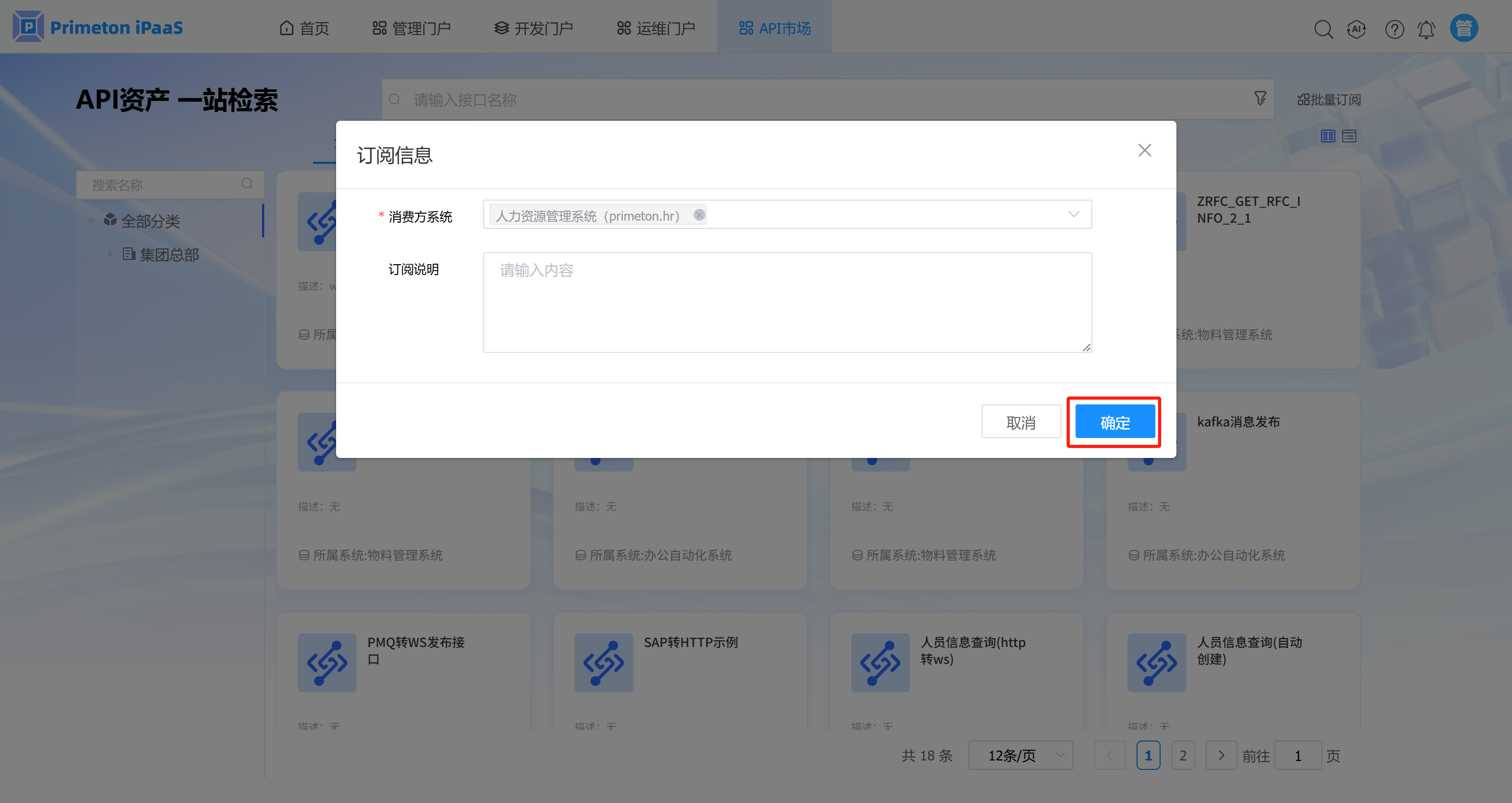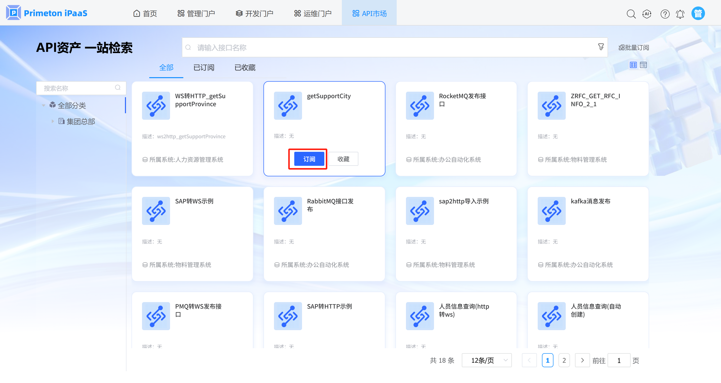 2. 点击API资产全部列表中,选择需要订阅的API,点击API卡片中的“订阅”按钮,进入到API订阅页面。