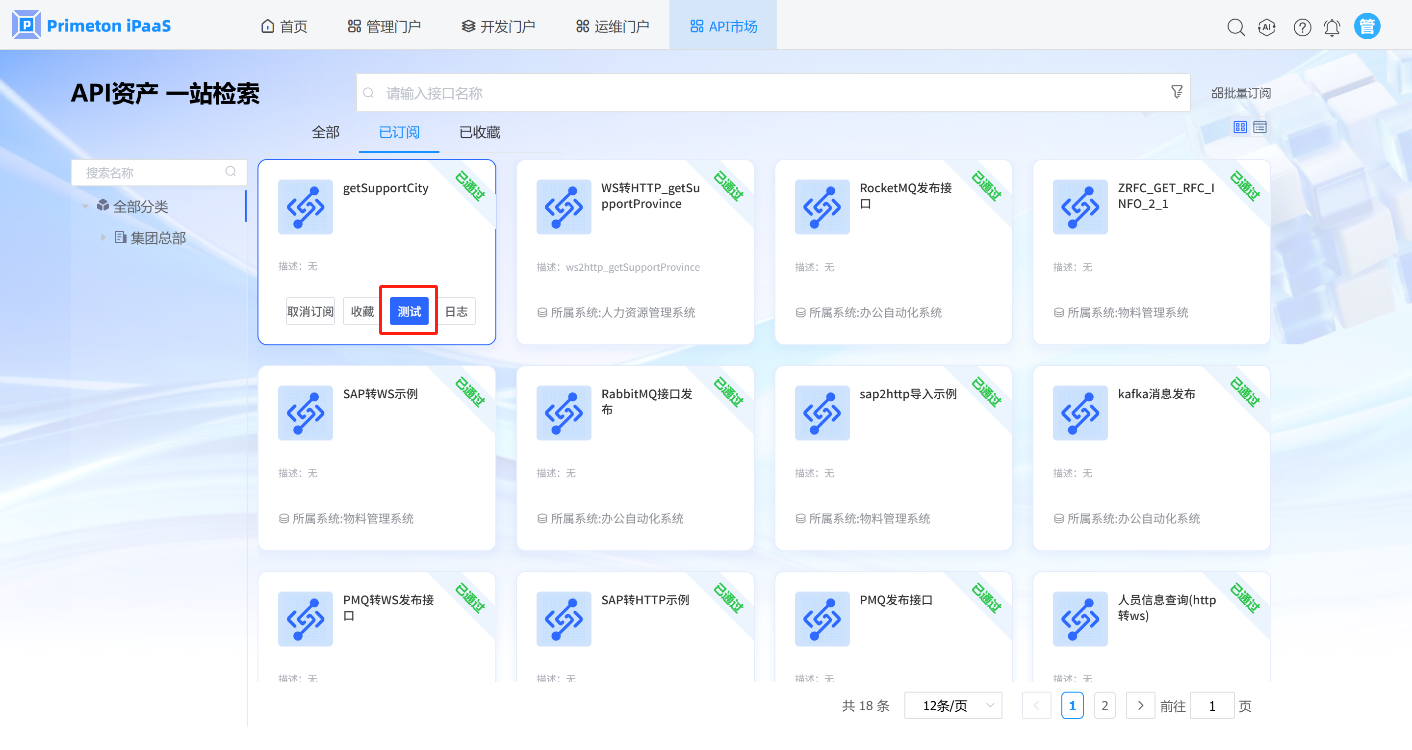 1. 在”已订阅”页面,找到刚才订阅的接口信息,点击”测试”按钮,进入到”测试”页面。
