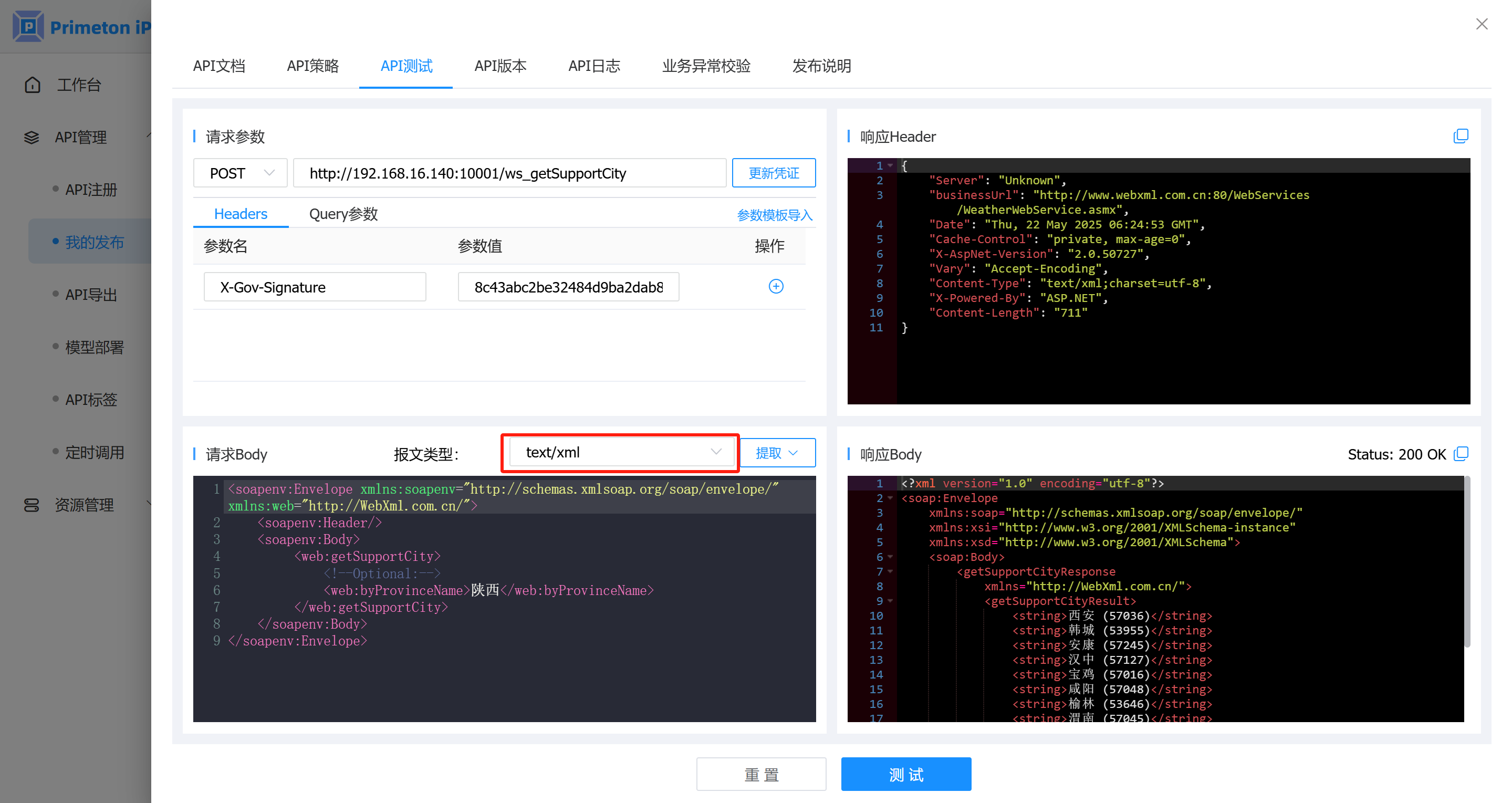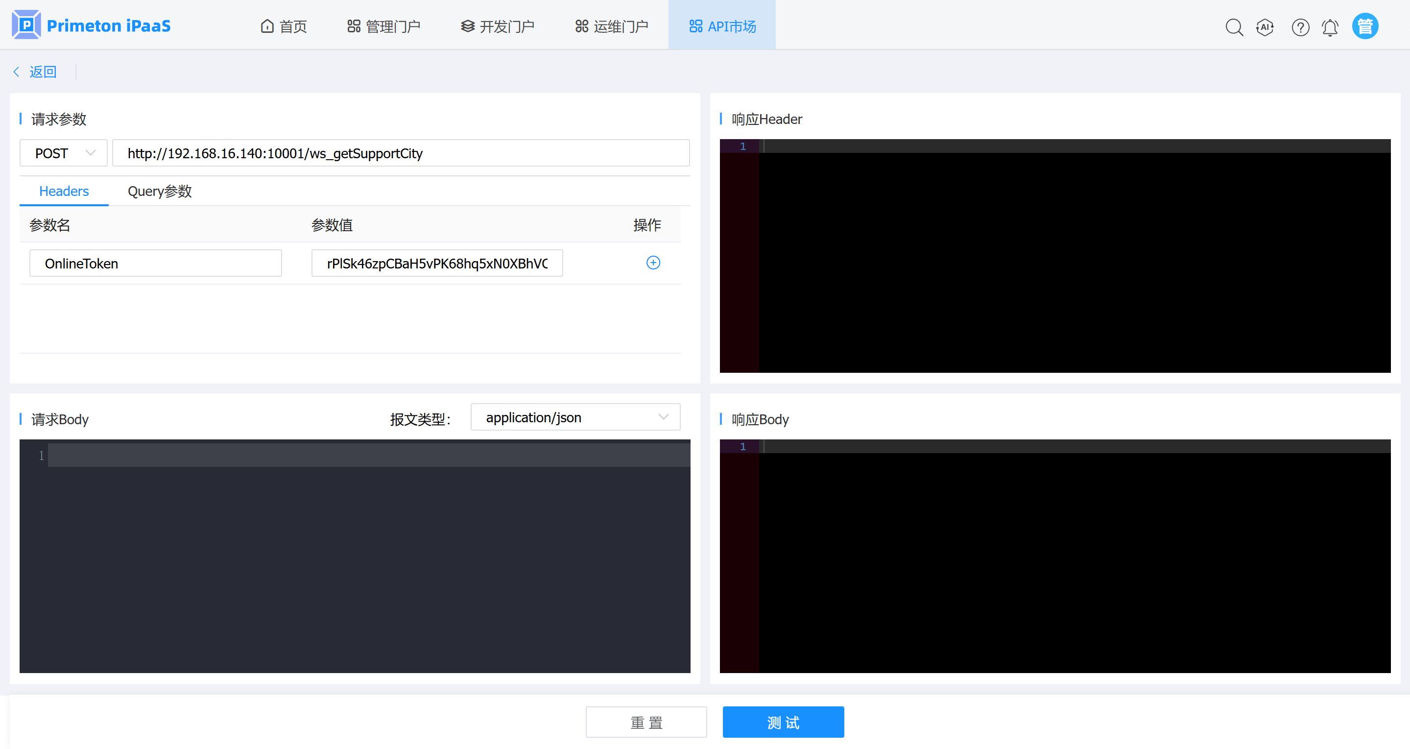 2. 在”测试”页面,输入请求参数,点击”测试”按钮,即可看到接口的响应结果。