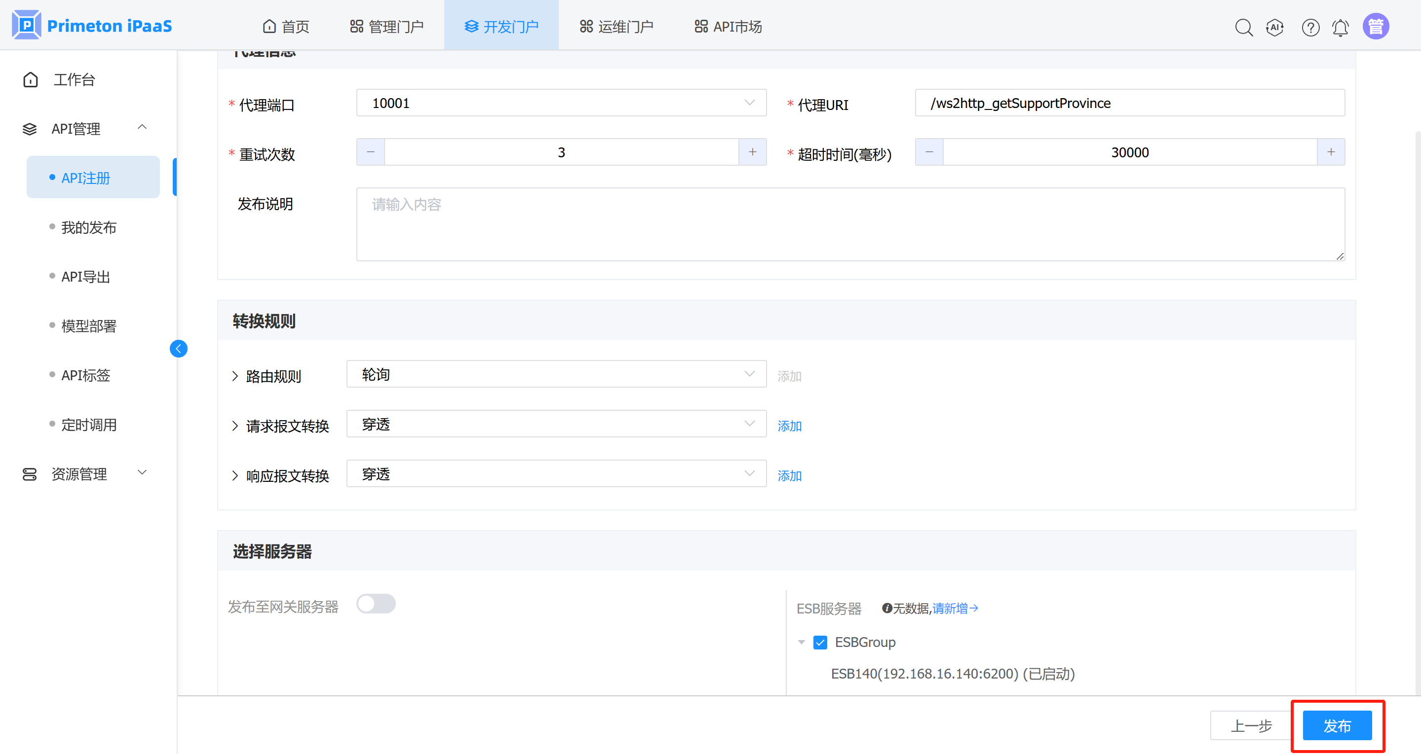 选择”代理端口”,填写”代理URI”,这里填写上一步选择接口的名称作为代理URI,选择ESB服务器,即可完成接口信息配置。