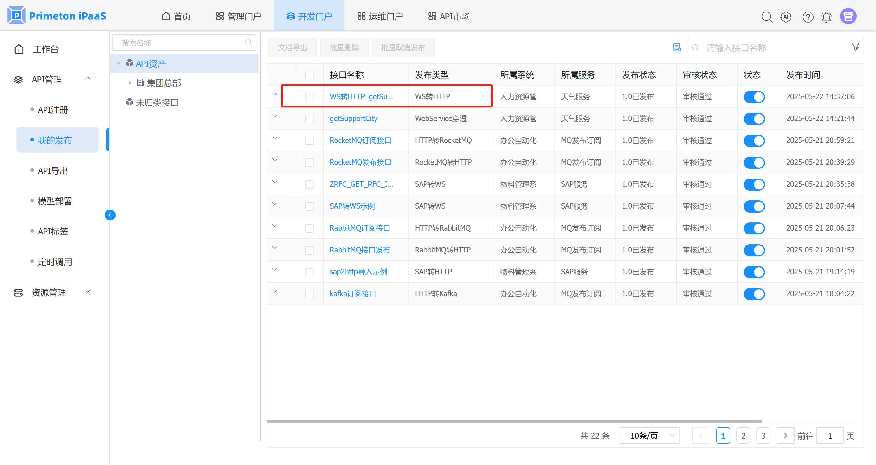 在”开发门户”,点击”API管理 -> 我的发布”菜单,进入到”我的发布”页面,可以查看刚才发布的接口信息。