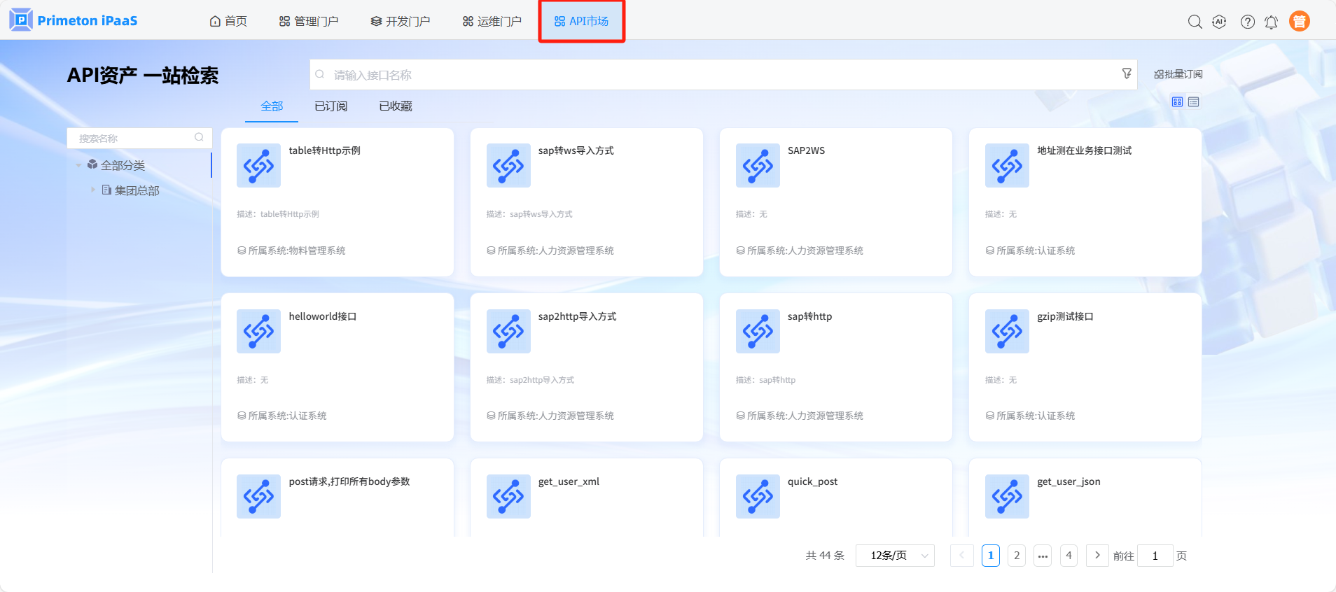 使用manager账号(默认密码:000000)登录系统,点击API市场,进入API市场。