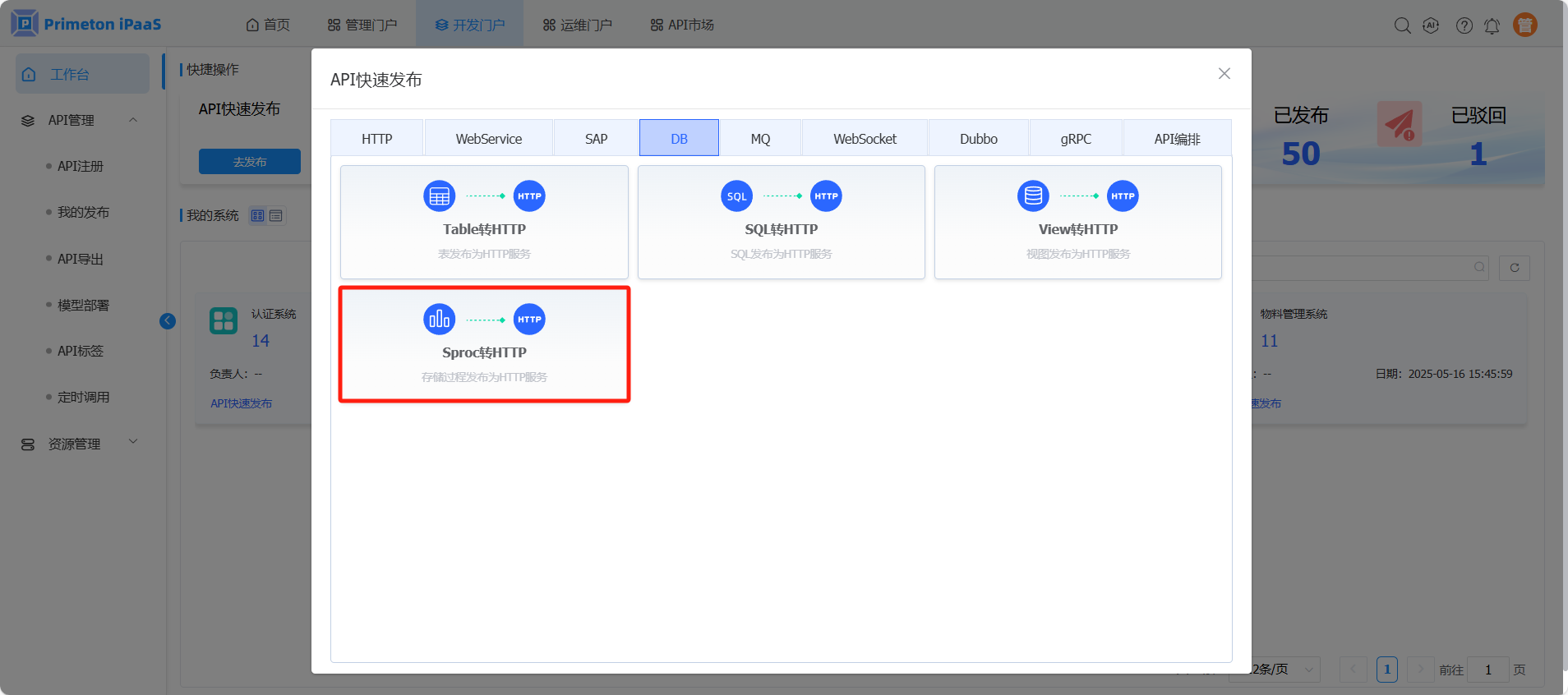 “API快速发布“弹窗,选择”DB“页签,点击”Sproc转HTTP“按钮,进入”Sproc发布“页面。