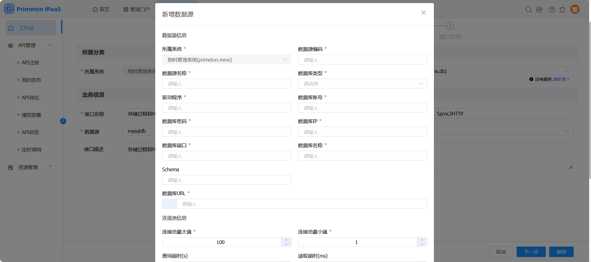 参数 说明 所属系统 数据源所属系统 数据源编码 数据源编码 数据源名称 数据源名称 数据库类型 数据库类型,可选MySql、Oracle、PostgreSQL、SQLServer、DM、openGaussDB、GBase8a、HighGoDB、KingbaseES、UXDB、Oscar、GBase8s 驱动程序 驱动程序驱动 数据库账号 数据库账号 数据库密码 数据库密码 数据库IP 数据库服务器IP 数据库端口 数据库端口 数据库名称 数据库名称 Schema 数据库Schema 数据库URL 数据库URL 连接池最大值 接池最大值 连接池最小值 连接池最小值 查询超时(s) 数据库查询超时时间,的那位秒 读取超时(ms) 数据库读取超时,单位毫秒 测试SQL语句 连接连通性测试SQL语句 “业务信息配置”信息填写完成后,点击“下一步”按钮,进入“接口发布”页面,在接口发布页面填写相关参数,点击“发布”按钮,即可完成对存储过程的发布操作。