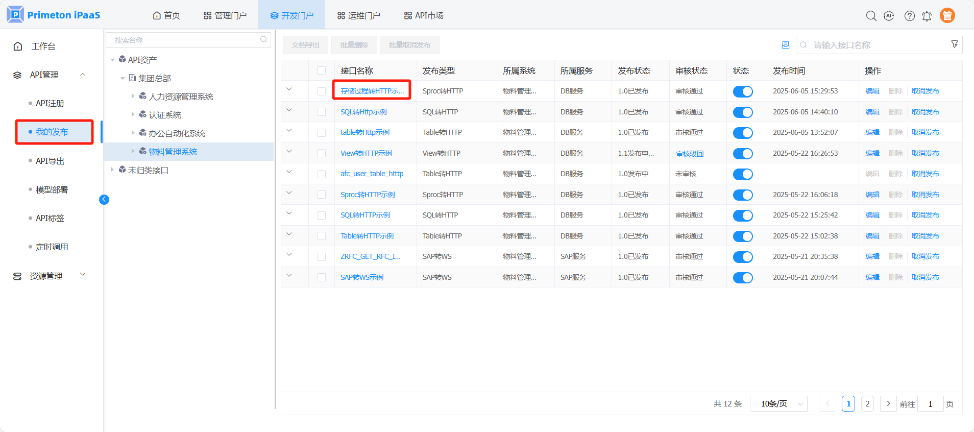参数 说明 代理端口 接口发布的代理端口号 代理URI 接口发布后的代理URI 发布说明 发布说明 存储过程 存储过程输入、输出参数 选择服务器 接口发布的服务器 进入开发门户,点击菜单“API管理”>"我的发布",进入“我的发布”页面,选择左侧组织树中本章节新增API的所属系统,在右侧界面可查看本章节创建的存储过程转HTTP接口的发布记录。