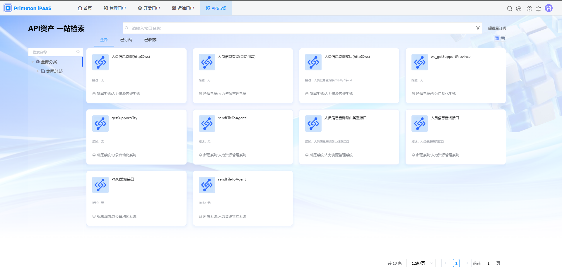 1.使用manager账号(默认密码:000000)登录系统,点击“API市场”,进入”全部“页签。