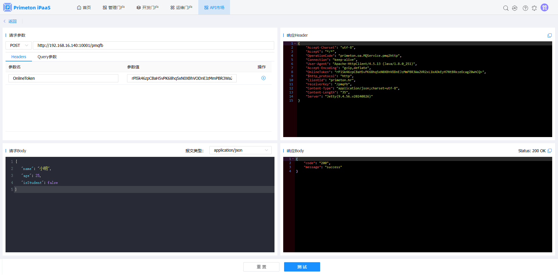 4.在“接口测试”页面,按业务接口的需求,填写访问配置项,点击“测试”按钮,进行接口测试。