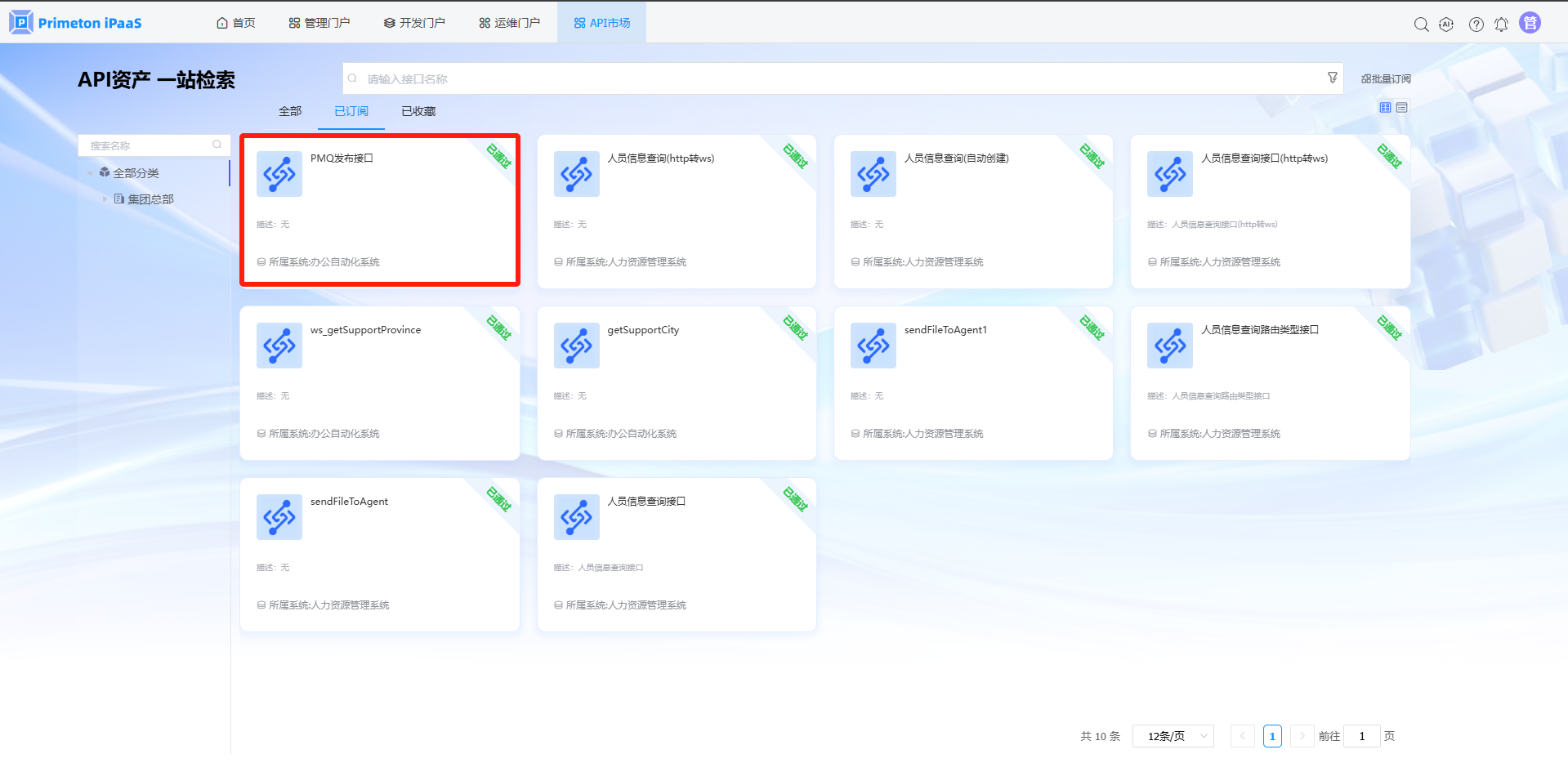 2.在“全部”页面,查看已发布的接口,点击”订阅”,申请订阅接口。