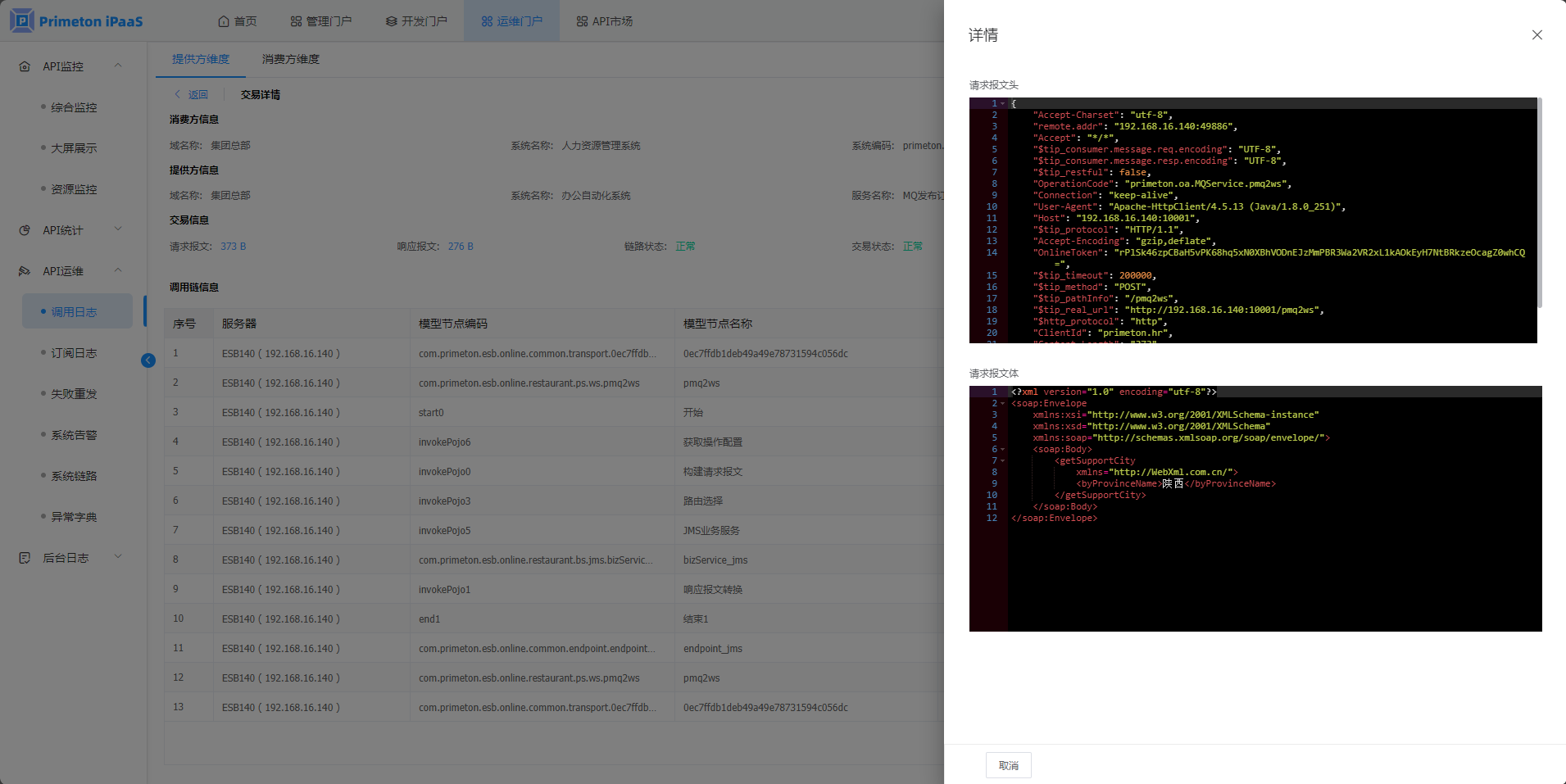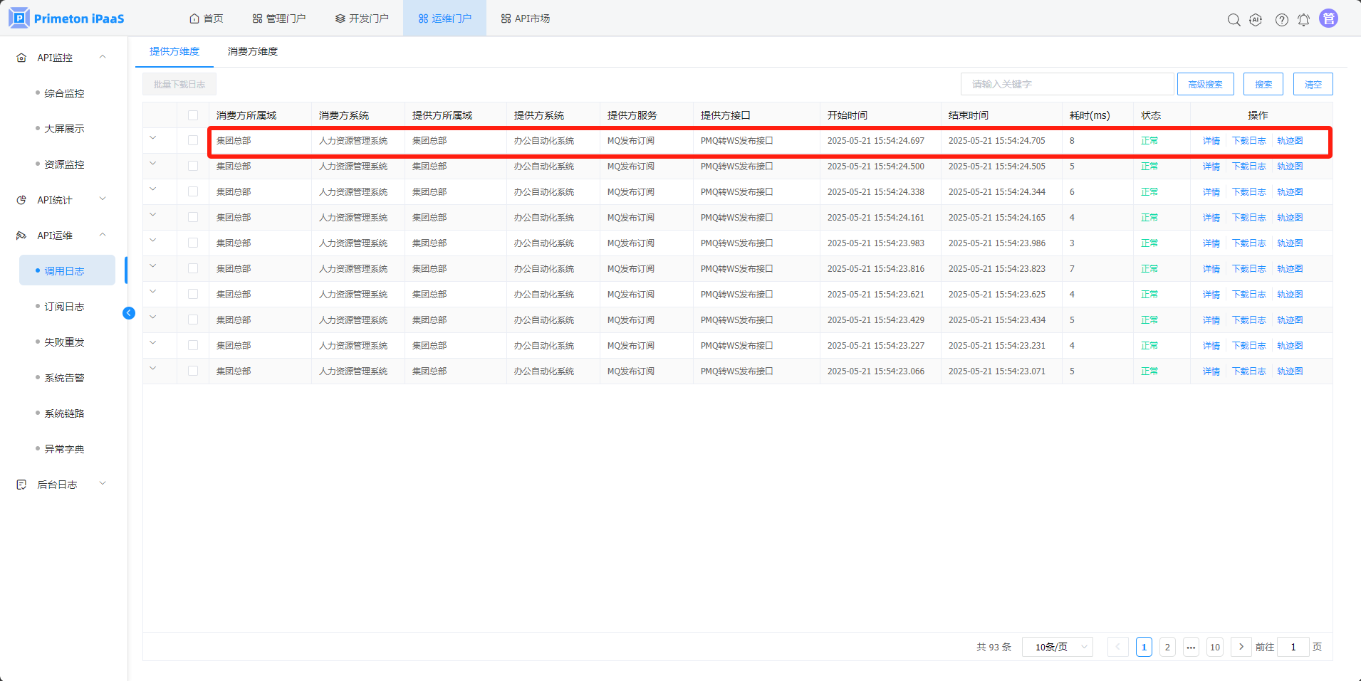 点击菜单“API运维”>"调用日志",进入“调用日志”页面。