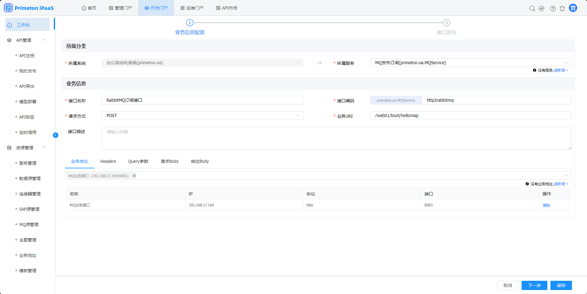 3.“API快速发布“弹窗,选择”MQ“页签,点击"RabbitMQ”转HTTP“按钮,进入”RabbitMQ转HTTP“接口发布页面。