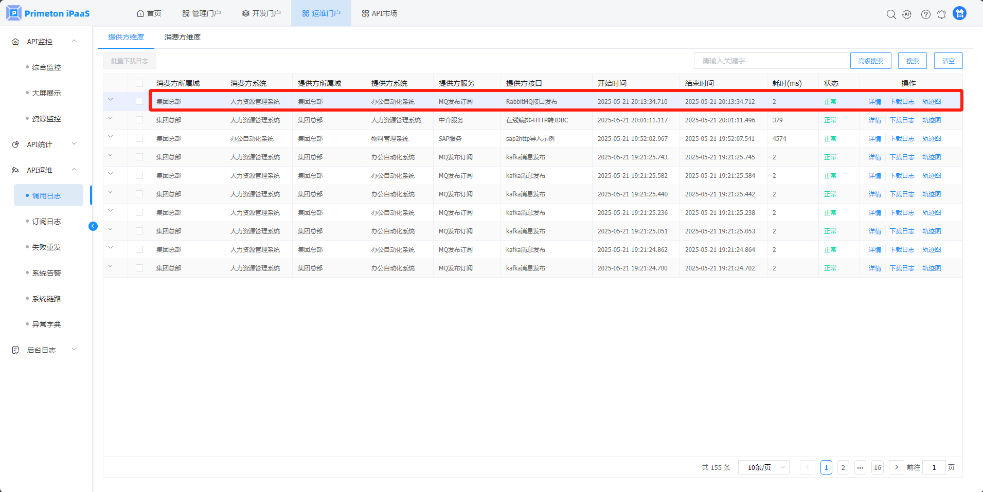 1. 点击菜单“API运维”>"调用日志",进入“调用日志”页面。